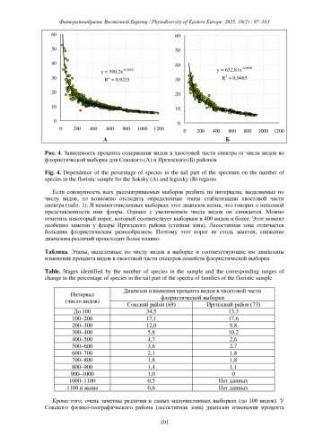 Анализ спектра семейств занимает важное место в исследовании систематической структуры флоры. При этом первостепенное внимание отводится головной части спектра, что вполне обосновано: в ней заключена большая часть видового состава, при этом перечень и последовательность семейств отражает географическое положение флоры (Schmidt, 1980; Malyshev, 1972 et al.). Однако исключать часть спектра, включающую семейств с небольшим числом видов (хвостовая часть), не вполне правомерно, так как в ней также заключена определенная часть информации, характеризующая состояние флоры.