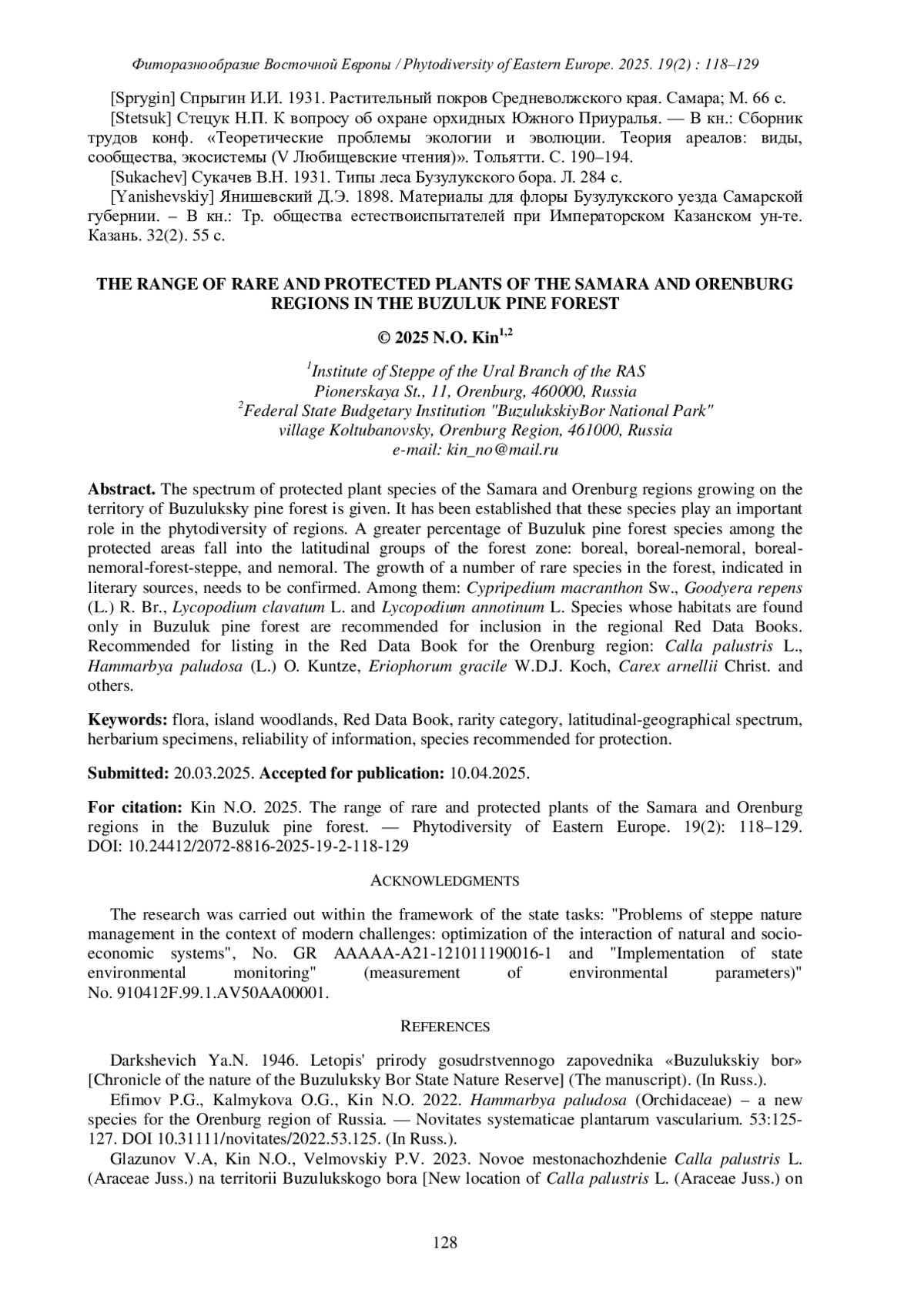 КИН Н. О. СПЕКТР РЕДКИХ И ОХРАНЯЕМЫХ РАСТЕНИЙ САМАРСКОГО И ОРЕНБУРГСКОГО РЕГИОНОВ В УСЛОВИЯХ БУЗУЛУКСКОГО БОРА // ФИТОРАЗНООБРАЗИЕ ВОСТОЧНОЙ ЕВРОПЫ. 2025. Т. 19 № 2