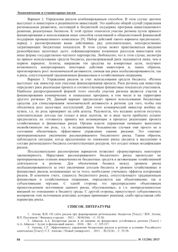 1. Агеева, В.Н. Об учѐте рисков при формировании региональных бюджетов [Текст] / В.Н. Агеева, В.П. Постников // Финансы и кредит. - 2013. - №38(566). - С. 52-56. EDN: RDMOXF
