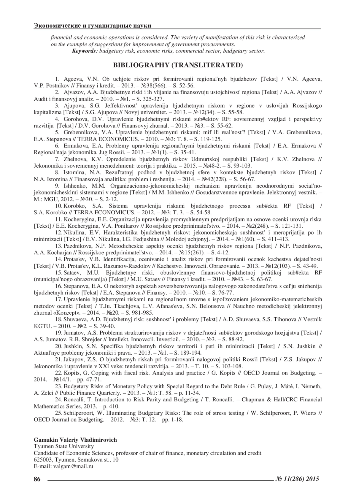 7. Желнова, К.В. Определение бюджетных рисков Удмуртской республики [Текст] / К.В. Желнова // Экономика и современный менеджмент: теория и практика. - 2015. - №48-2. - С. 93-103. EDN: TPEYWF