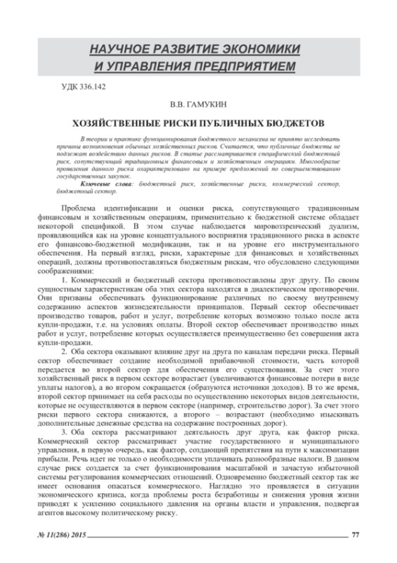 В теории и практике функционирования бюджетного механизма не принято исследовать причины возникновения обычных хозяйственных рисков. Считается, что публичные бюджеты не подлежат воздействию данных рисков. В статье рассматривается специфический бюджетный риск, сопутствующий традиционным финансовым и хозяйственным операциям. Многообразие проявления данного риска охарактеризовано на примере предложений по совершенствованию государственных закупок