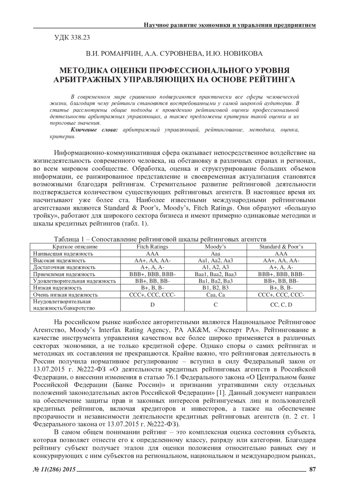 Информационно-коммуникативная сфера оказывает непосредственное воздействие на жизнедеятельность современного человека, на обстановку в различных странах и регионах, во всем мировом сообществе. Обработка, оценка и структурирование больших объемов информации, ее ранжированное представление и своевременная актуализация становятся возможными благодаря рейтингам. Стремительное развитие рейтинговой деятельности подтверждается количеством существующих рейтинговых агентств. В настоящее время их насчитывают уже более ста. Наиболее известными международными рейтинговыми агентствами являются Standard & Poor’s, Moody’s, Fitch Ratings. Они образуют «большую тройку», работают для широкого сектора бизнеса и имеют примерно одинаковые методики и шкалы кредитных рейтингов (табл. 1).