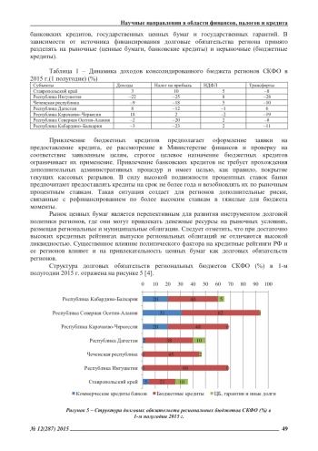 В статье рассматривается проблематика государственного регулирования финансовой самостоятельности российских региональных бюджетов, раскрывается динамика доли региональных доходов и расходов в консолидированном бюджете РФ, определяются структурные компоненты долговатого финансирования по региональным субъектам СКФО (банковские кредиты, бюджетные кредиты, ценные бумаги, государственные гарантии)