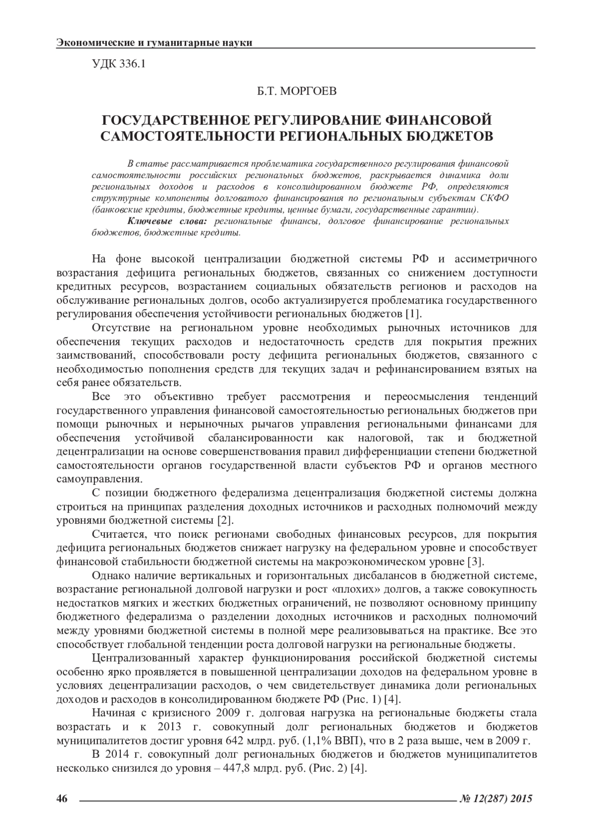 На фоне высокой централизации бюджетной системы РФ и ассиметричного возрастания дефицита региональных бюджетов, связанных со снижением доступности кредитных ресурсов, возрастанием социальных обязательств регионов и расходов на обслуживание региональных долгов, особо актуализируется проблематика государственного регулирования обеспечения устойчивости региональных бюджетов