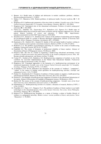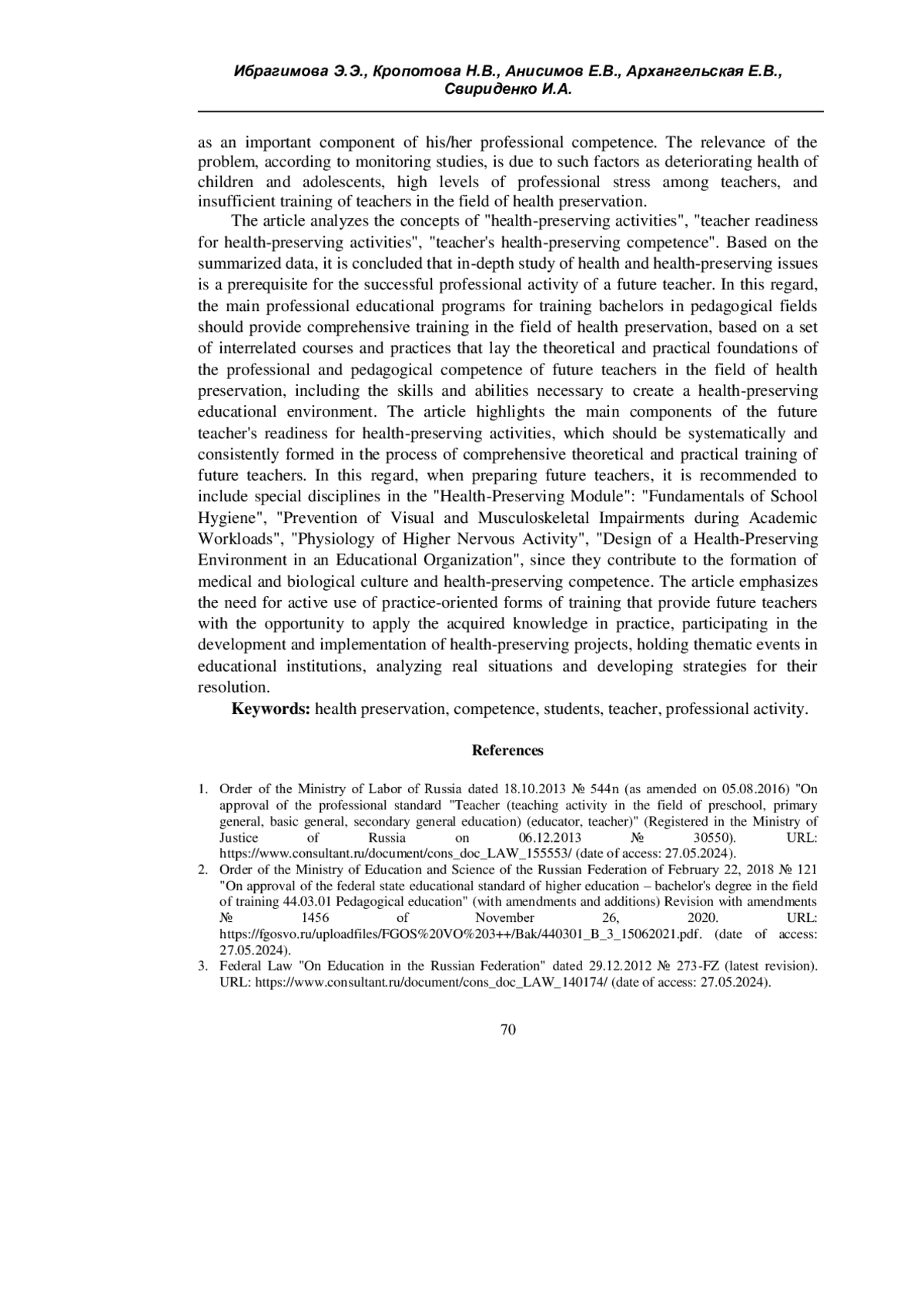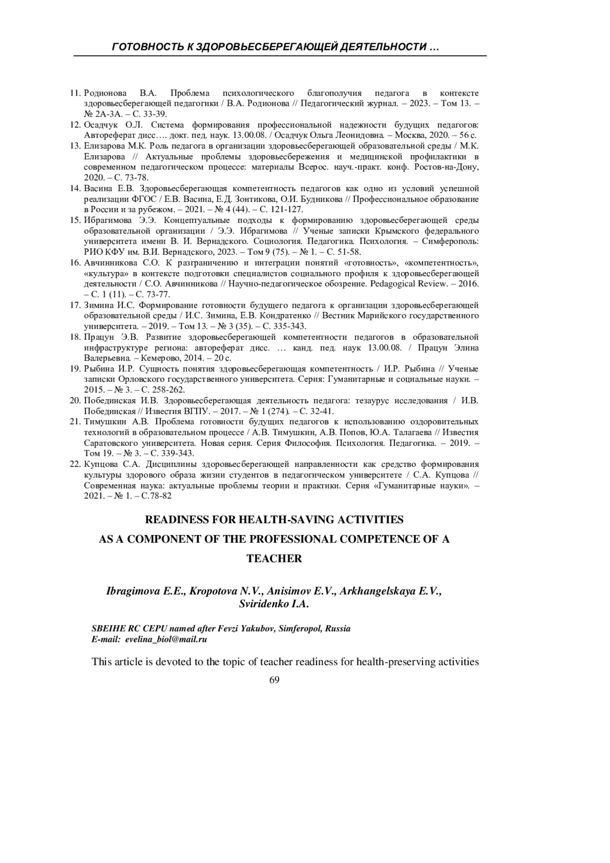 ИБРАГИМОВА Э. Э., КРОПОТОВА Н. В., АНИСИМОВ Е. В., АРХАНГЕЛЬСКАЯ Е. В., СВИРИДЕНКО И. А. ГОТОВНОСТЬ К ЗДОРОВЬЕСБЕРЕГАЮЩЕЙ ДЕЯТЕЛЬНОСТИ КАК СОСТАВЛЯЮЩАЯ ПРОФЕССИОНАЛЬНОЙ КОМПЕТЕНТНОСТИ ПЕДАГОГА // УЧЕНЫЕ ЗАПИСКИ КРЫМСКОГО ФЕДЕРАЛЬНОГО УНИВЕРСИТЕТА ИМЕНИ В. И. ВЕРНАДСКОГО. СОЦИОЛОГИЯ. ПЕДАГОГИКА. ПСИХОЛОГИЯ. 2025. ТОМ 11 (77). № 3