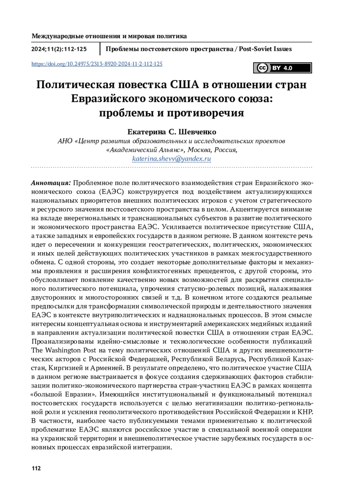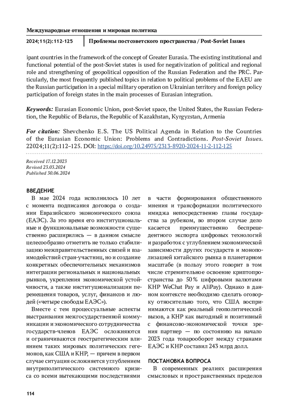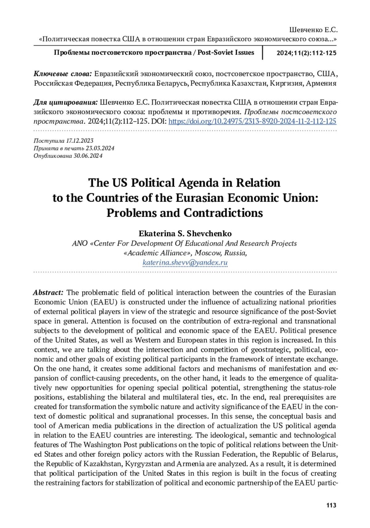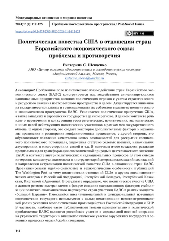 Проблемное поле политического взаимодействия стран Евразийского экономического союза (ЕАЭС) конструируется под воздействием актуализирующихся национальных приоритетов внешних политических игроков с учетом стратегического и ресурсного значения постсоветского пространства в целом. Акцентируется внимание на вкладе внерегиональных и транснациональных субъектов в развитие политического и экономического пространства ЕАЭС. Усиливается политическое присутствие США, а также западных и европейских государств в данном регионе. В данном контексте речь идет о пересечении и конкуренции геостратегических, политических, экономических и иных целей действующих политических участников в рамках межгосударственного обмена. С одной стороны, это создает некоторые дополнительные факторы и механизмы проявления и расширения конфликтогенных прецедентов, с другой стороны, это обусловливает появление качественно новых возможностей для раскрытия специального политического потенциала, упрочения статусно-ролевых позиций, налаживания двусторонних и многосторонних связей и т. д. В конечном итоге создаются реальные предпосылки для трансформации символической природы и деятельностного значения ЕАЭС в контексте внутриполитических и наднациональных процессов. В этом смысле интересны концептуальная основа и инструментарий американских медийных изданий в направлении актуализации политической повестки США в отношении стран ЕАЭС. Проанализированы идейно-смысловые и технологические особенности публикаций The Washington Post на тему политических отношений США и других внешнеполитических акторов с Российской Федерацией, Республикой Беларусь, Республикой Казахстан, Киргизией и Арменией. В результате определено, что политическое участие США в данном регионе выстраивается в фокусе создания сдерживающих факторов стабилизации политико-экономического партнерства стран-участниц ЕАЭС в рамках концепта «большой Евразии». Имеющийся институциональный и функциональный потенциал постсоветских государств используется с целью негативизации политико-региональной роли и усиления геополитического противодействия Российской Федерации и КНР. В частности, наиболее часто публикуемыми темами применительно к политической проблематике ЕАЭС являются российское участие в специальной военной операции на украинской территории и внешнеполитическое участие зарубежных государств в основных процессах евразийской интеграции.