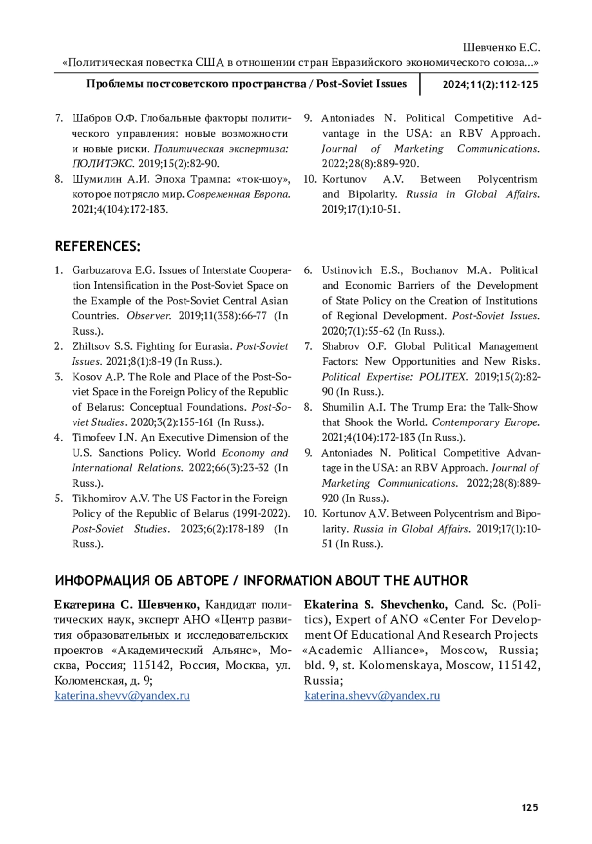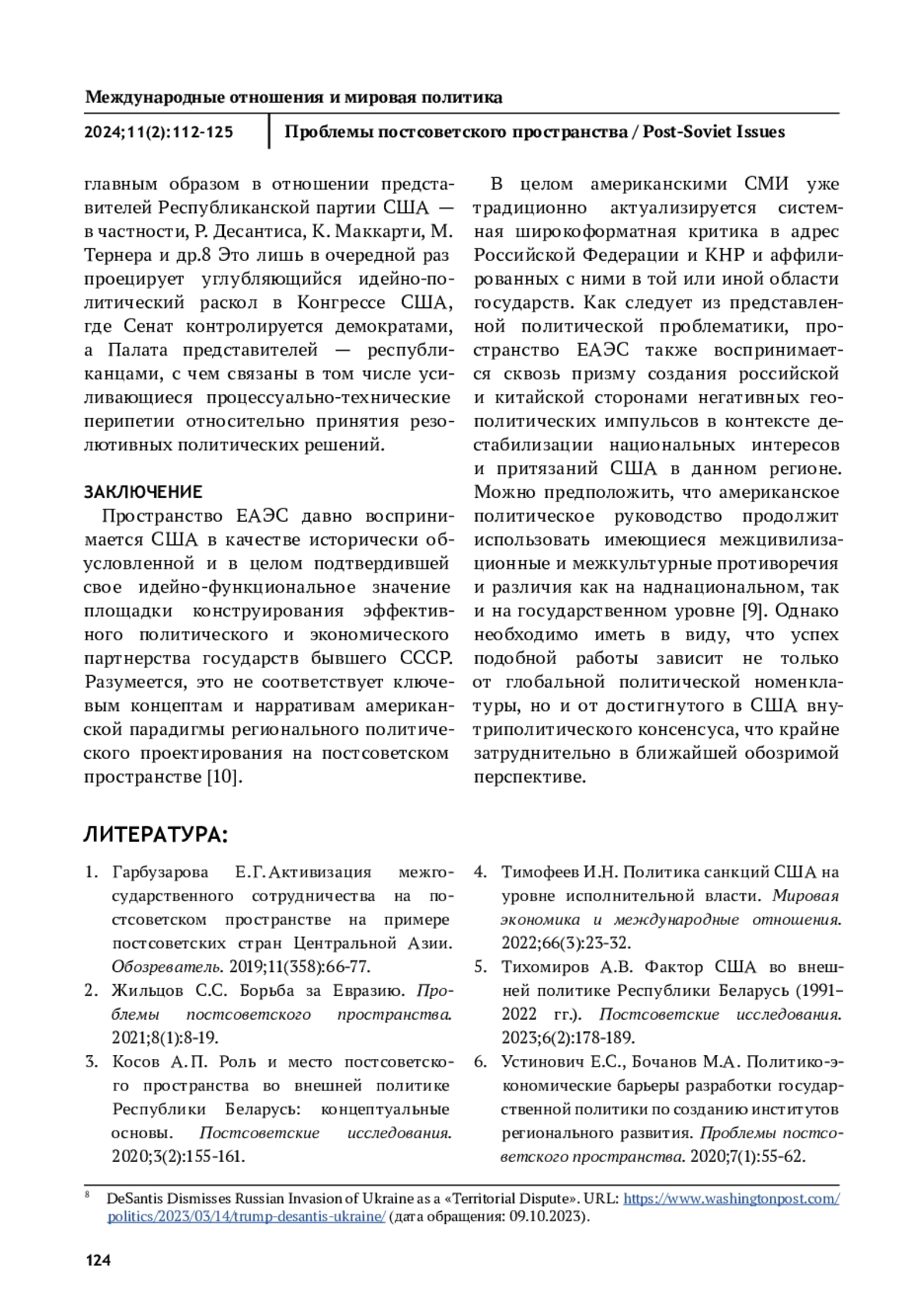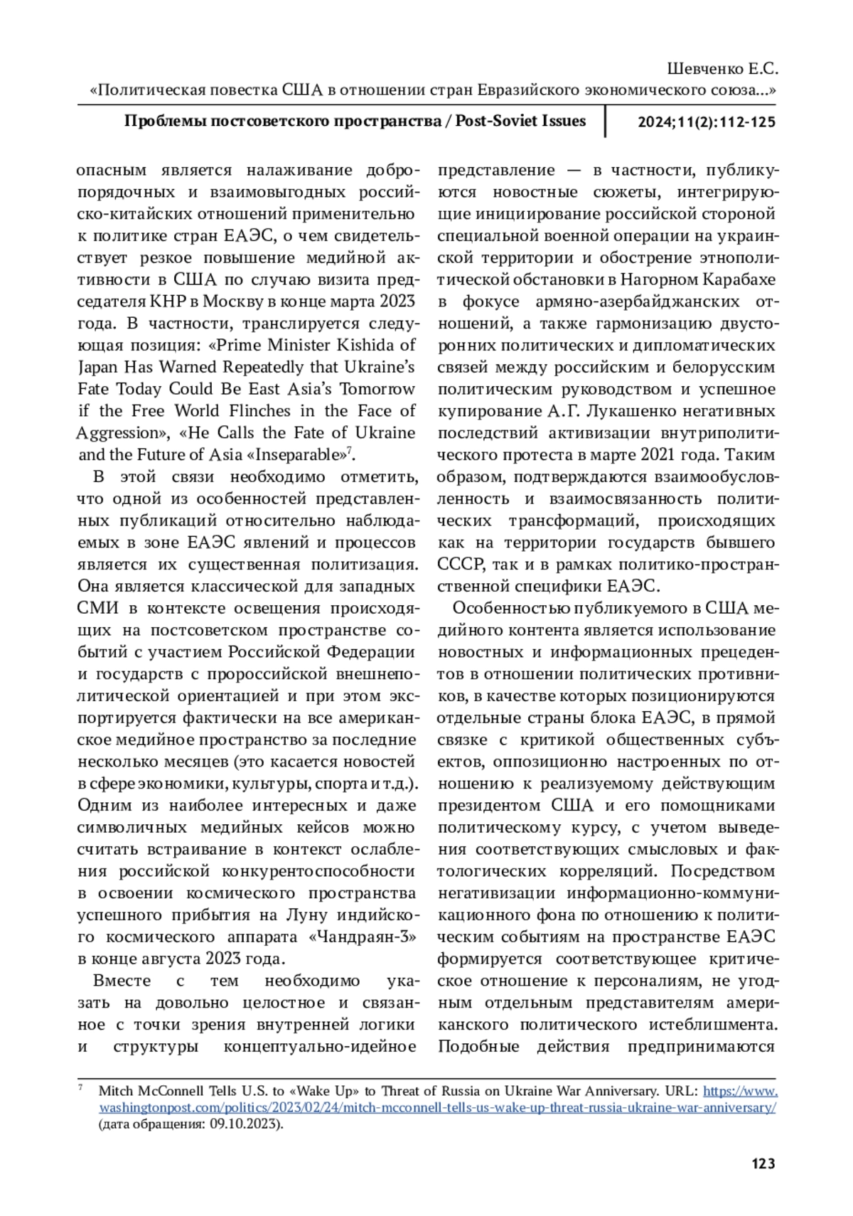 Проблемное поле политического взаимодействия стран Евразийского экономического союза (ЕАЭС) конструируется под воздействием актуализирующихся национальных приоритетов внешних политических игроков с учетом стратегического и ресурсного значения постсоветского пространства в целом. Акцентируется внимание на вкладе внерегиональных и транснациональных субъектов в развитие политического и экономического пространства ЕАЭС. Усиливается политическое присутствие США, а также западных и европейских государств в данном регионе. В данном контексте речь идет о пересечении и конкуренции геостратегических, политических, экономических и иных целей действующих политических участников в рамках межгосударственного обмена. С одной стороны, это создает некоторые дополнительные факторы и механизмы проявления и расширения конфликтогенных прецедентов, с другой стороны, это обусловливает появление качественно новых возможностей для раскрытия специального политического потенциала, упрочения статусно-ролевых позиций, налаживания двусторонних и многосторонних связей и т. д. В конечном итоге создаются реальные предпосылки для трансформации символической природы и деятельностного значения ЕАЭС в контексте внутриполитических и наднациональных процессов. В этом смысле интересны концептуальная основа и инструментарий американских медийных изданий в направлении актуализации политической повестки США в отношении стран ЕАЭС. Проанализированы идейно-смысловые и технологические особенности публикаций The Washington Post на тему политических отношений США и других внешнеполитических акторов с Российской Федерацией, Республикой Беларусь, Республикой Казахстан, Киргизией и Арменией. В результате определено, что политическое участие США в данном регионе выстраивается в фокусе создания сдерживающих факторов стабилизации политико-экономического партнерства стран-участниц ЕАЭС в рамках концепта «большой Евразии». Имеющийся институциональный и функциональный потенциал постсоветских государств используется с целью негативизации политико-региональной роли и усиления геополитического противодействия Российской Федерации и КНР. В частности, наиболее часто публикуемыми темами применительно к политической проблематике ЕАЭС являются российское участие в специальной военной операции на украинской территории и внешнеполитическое участие зарубежных государств в основных процессах евразийской интеграции.