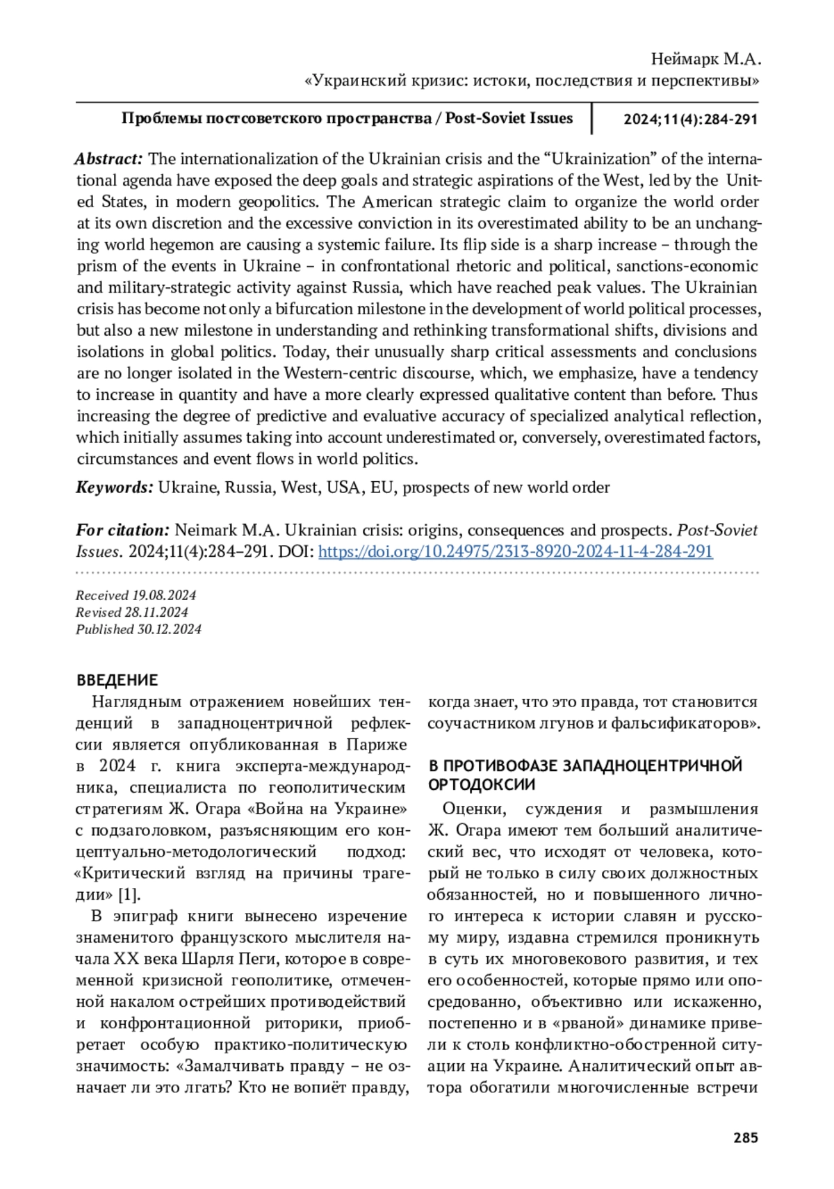 Интернационализация украинского кризиса и «украинизация» международной повестки обнажили глубинные цели и стратегические устремления Запада во главе с США в современной геополитике. Американская стратегическая претензия на организацию по собственному усмотрению мирового порядка и чрезмерная убежденность в своей переоцененной способности быть неизменным мировым гегемоном дают системный сбой. Его оборотная сторона – резкое усиление – через призму событий на Украине – конфронтационной риторики и политической, санкционно-экономической и военной-стратегической активности против России, которые достигли пиковых значений. Украинский кризис стал не только бифуркационной вехой в развитии мирополитических процессов, но и новой рубежной точкой отсчета в осмыслении и переосмыслении трансформационных сдвигов, размежеваний и обособлений в глобальной политике. Сегодня уже не единичны в западноцентричном дискурсе их непривычно острые критические оценки и выводы, которые подчеркнем, имеют тенденцию к количественному увеличению и более отчетливо выраженному, чем раньше, качественному контенту. Увеличивая тем самым степень прогнозно-оценочной выверенности профильной аналитической рефлексии, исходно предполагающей учет недооцененных или, наоборот, переоцененных факторов, обстоятельств и событийных потоков в мировой политике.