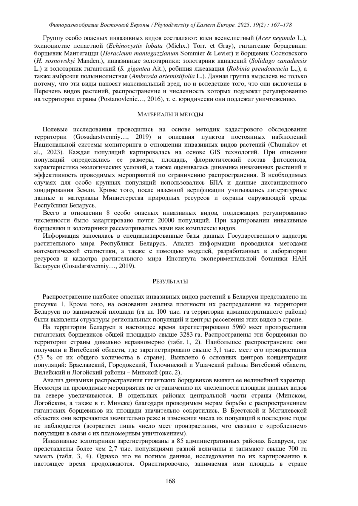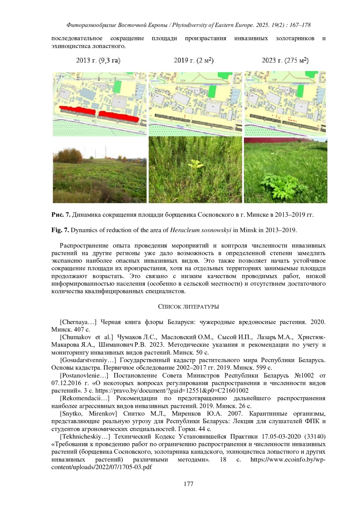 2. [Chumakov et al.] Чумаков Л.С., Масловский О.М., Сысой И.П., Лазарь М.А., Христюк-Макарова Я.А., Шиманович Р.В. 2023. Методические указания и рекомендации по учету и мониторингу инвазивных видов растений. Минск. 50 с.