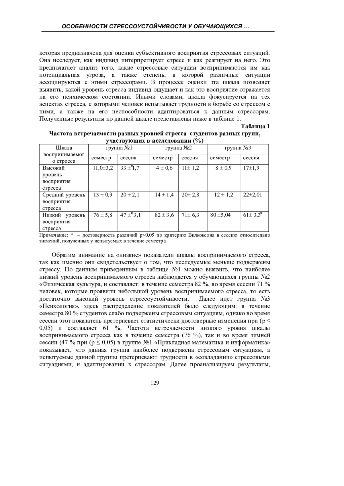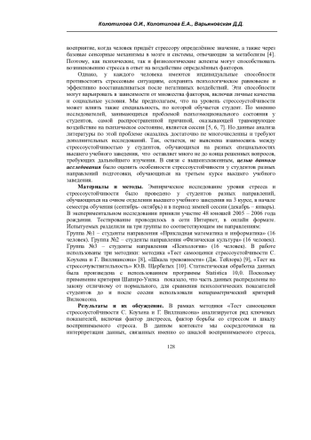Углубленные знания о протекании стрессовых реакций у обучающихся на разных направлениях подготовки в ВУЗе, а также их особенности проявления во время обучения в семестре, и во время сессии позволяют скоординировать обучающий процесс, и тем самым повысить результативность успеваемости. В связи с этим было проведено исследование, в котором участвующих в нем студентов поделили на три группы, в зависимости от их специальности обучения. В первую группу вошли студенты, обучающиеся по направлению подготовки «Прикладная математика и информатика», во вторую - обучающиеся по специальности «Физическая культура», и третью составили студенты направления «Психология». Анализ полученных результатов свидетельствует о том, что студенты, обучающиеся на разных направлениях в ВУЗе, в течение семестра имеют сходные проявления стрессоустойчивости, тревожности и стрессочувствительности, в то время, как в период сессии эти показатели значительно различаются в зависимости от направления подготовки обучения.