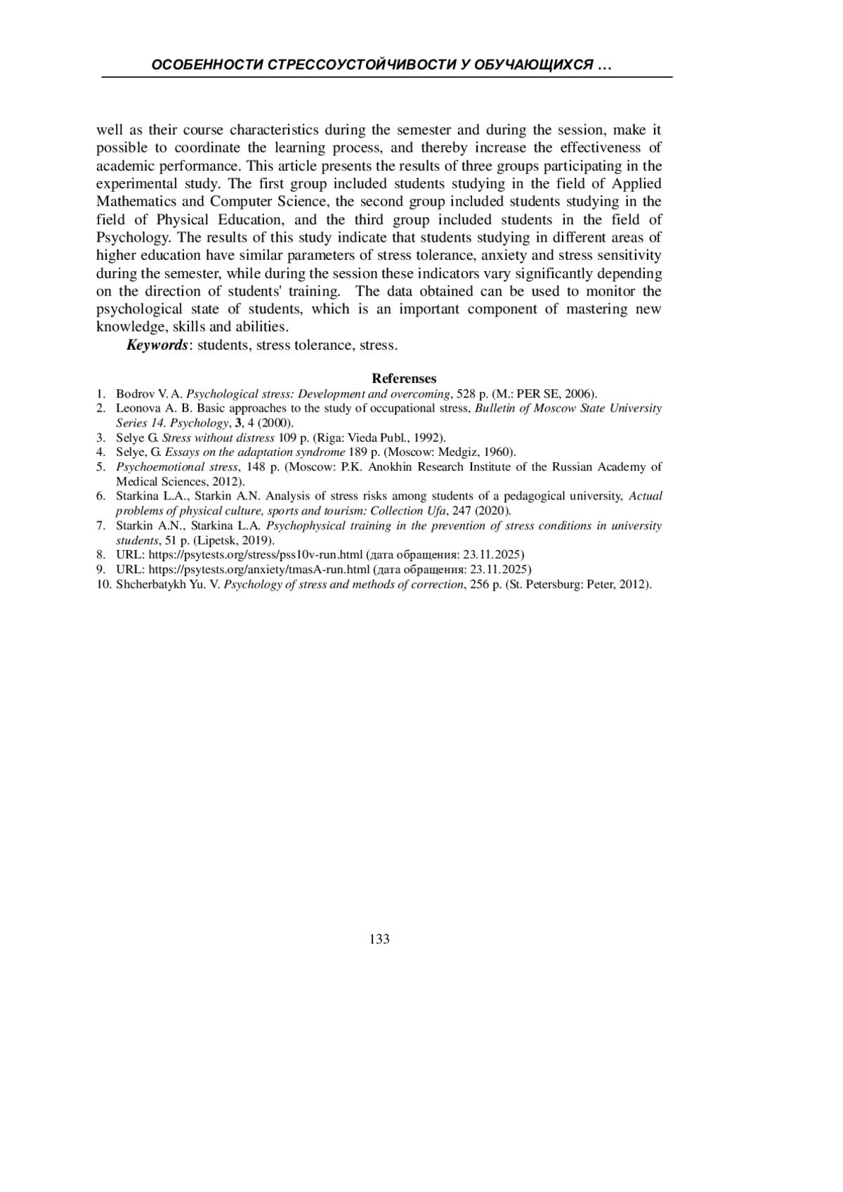 6. Старкина Л.А., Старкин А.Н. Анализ стрессовых рисков у студентов педагогического вуза // Актуальные проблемы физической культуры, спорта и туризма: Сб. - Уфа, 2020. - С. 247-251. EDN: FQYCDW