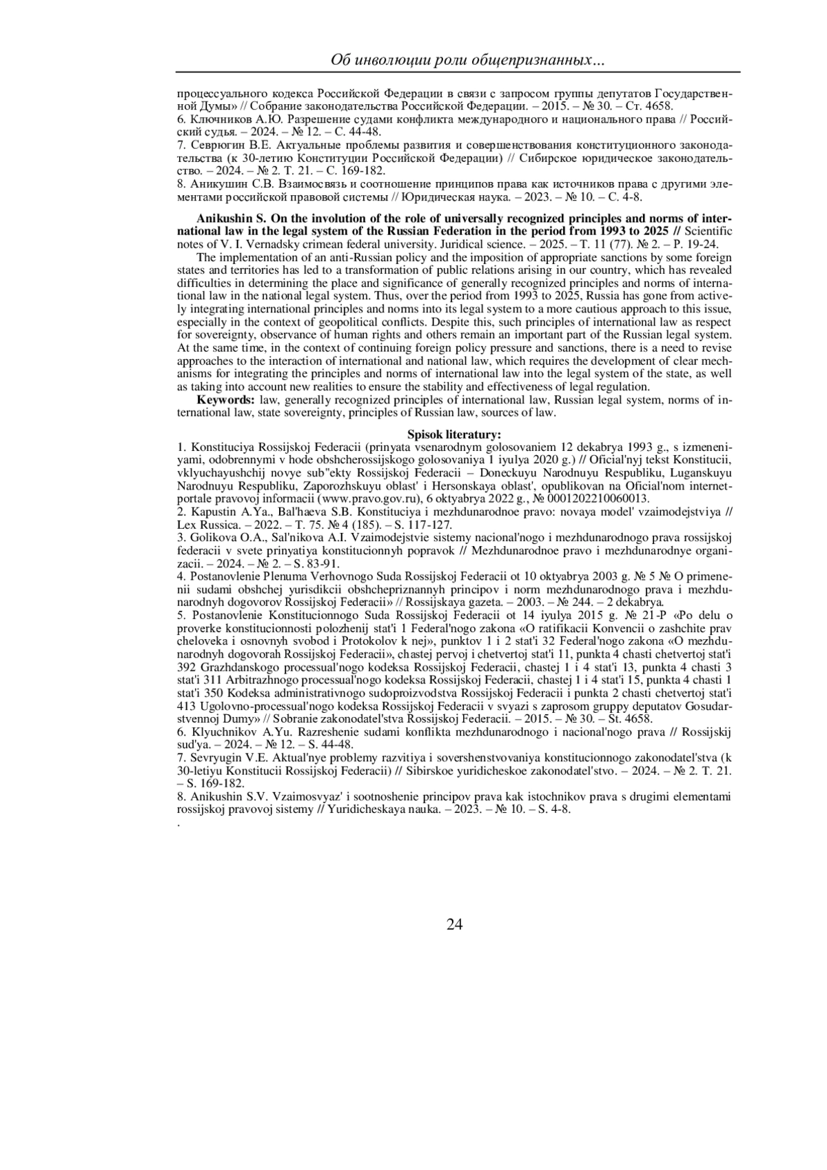 6. Ключников А.Ю. Разрешение судами конфликта международного и национального права // Российский судья. - 2024. - № 12. - С. 44-48. EDN: AIUBFW