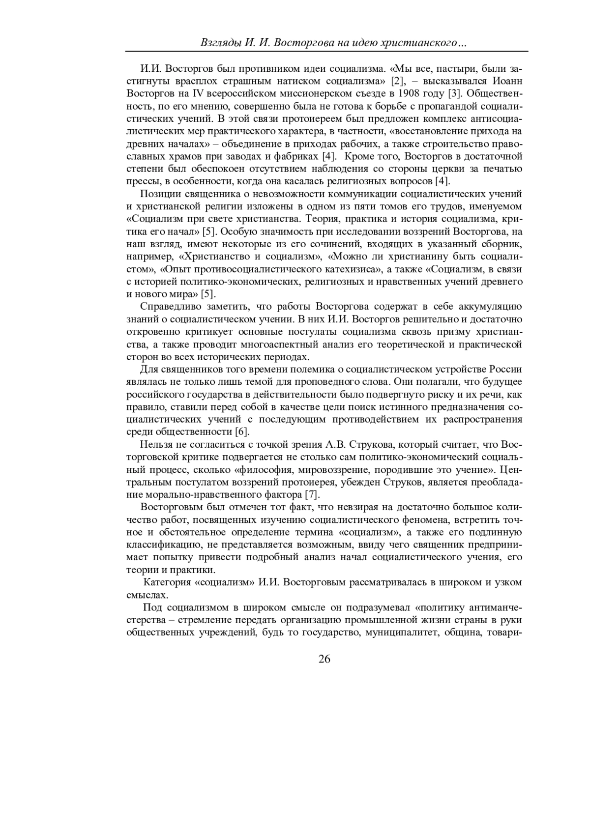 Статья посвящена рассмотрению взглядов миссионера, церковного и политического деятеля, священномученика И. И. Восторгова на идею сосуществования христианской и социалистической идеологий. Установлено, что в трудах Восторгова очевиден непрерывный и возрастающий интерес к социальной проблематике, выразившийся в попытке дать комплексный анализ и последовательную критику социалистических учений, а также наметить определенный курс на противостояние Русской Православной Церкви идеологии социализма. Протоиерей попытался доказать несовместимость христианского мировоззрения и социально-политических (социалистических) утопий, их разрушительной природы. Исследован один из сборников трудов И. И. Восторгова, посвященный вопросам теории, практики и истории социализма, критики его начал. Подчеркнута приверженность Восторгова политике борьбы с социалистической пропагандой посредством участия в IV всероссийском миссионерском съезде в 1908 году.