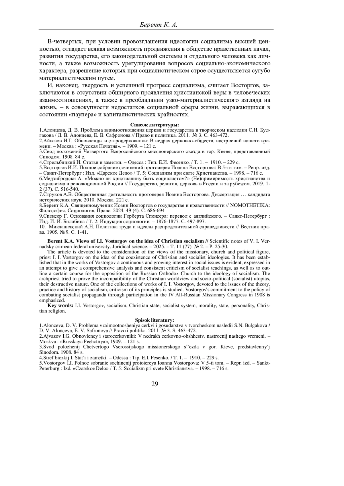 БЕРЕНТ К. А. ВЗГЛЯДЫ И. И. ВОСТОРГОВА НА ИДЕЮ ХРИСТИАНСКОГО СОЦИАЛИЗМА // УЧЕНЫЕ ЗАПИСКИ КРЫМСКОГО ФЕДЕРАЛЬНОГО УНИВЕРСИТЕТА ИМЕНИ В. И. ВЕРНАДСКОГО. ЮРИДИЧЕСКИЕ НАУКИ. 2025. ТОМ 11. №2