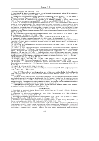 5. Бутов С. В. Обеспечение прав военнослужащих войск НКВД СССР в годы Великой Отечественной войны на надлежащий воинский быт как необходимое условие сохранения их боеспособности, жизни и здоровья / С. В. Бутов // Актуальные проблемы обеспечения безопасности личности, общества и государства в современных геополитических условиях: СНТВсерос. межвуз. круглого стола, С.-Пб, 17.03.2023 года. - С-Пб: Санкт-Петербургский военный ордена Жукова институт войск национальной гвардии РФ, 2024. - С. 43-47. EDN: VRMIIP