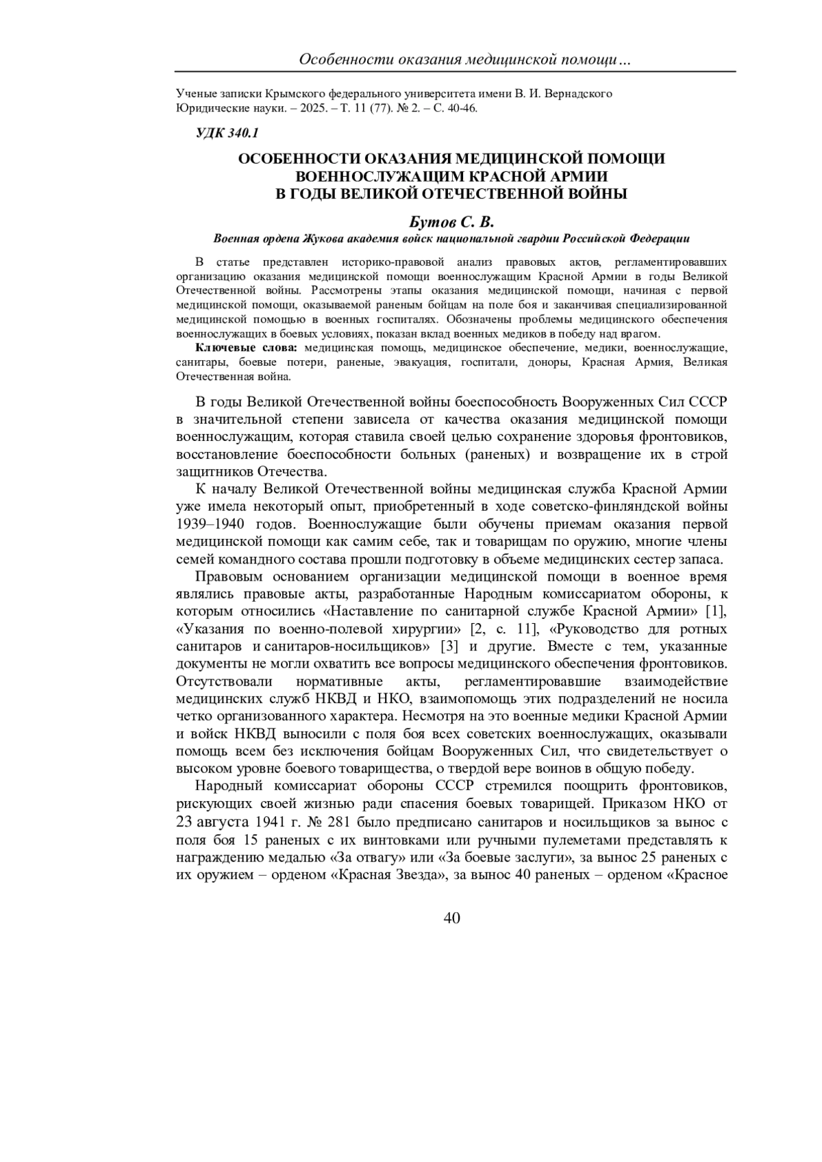 11. Бутов С. В. Роль советского военного законодательства в достижении победы СССР в Великой Отечественной войне / С. В. Бутов // Актуальные вопросы развития государственности и публичного права: Материалы IX междунар. науч.-практ. конференции. В 2-х томах, С-Пб, 29.09.2023 года. - С-Пб: Санкт-Петербургский институт (филиал)ФГБОУ ВО Всероссийский государственный университет юстиции (РПА Минюста России)“, 2023. - С. 103-114. EDN: PLOYHC