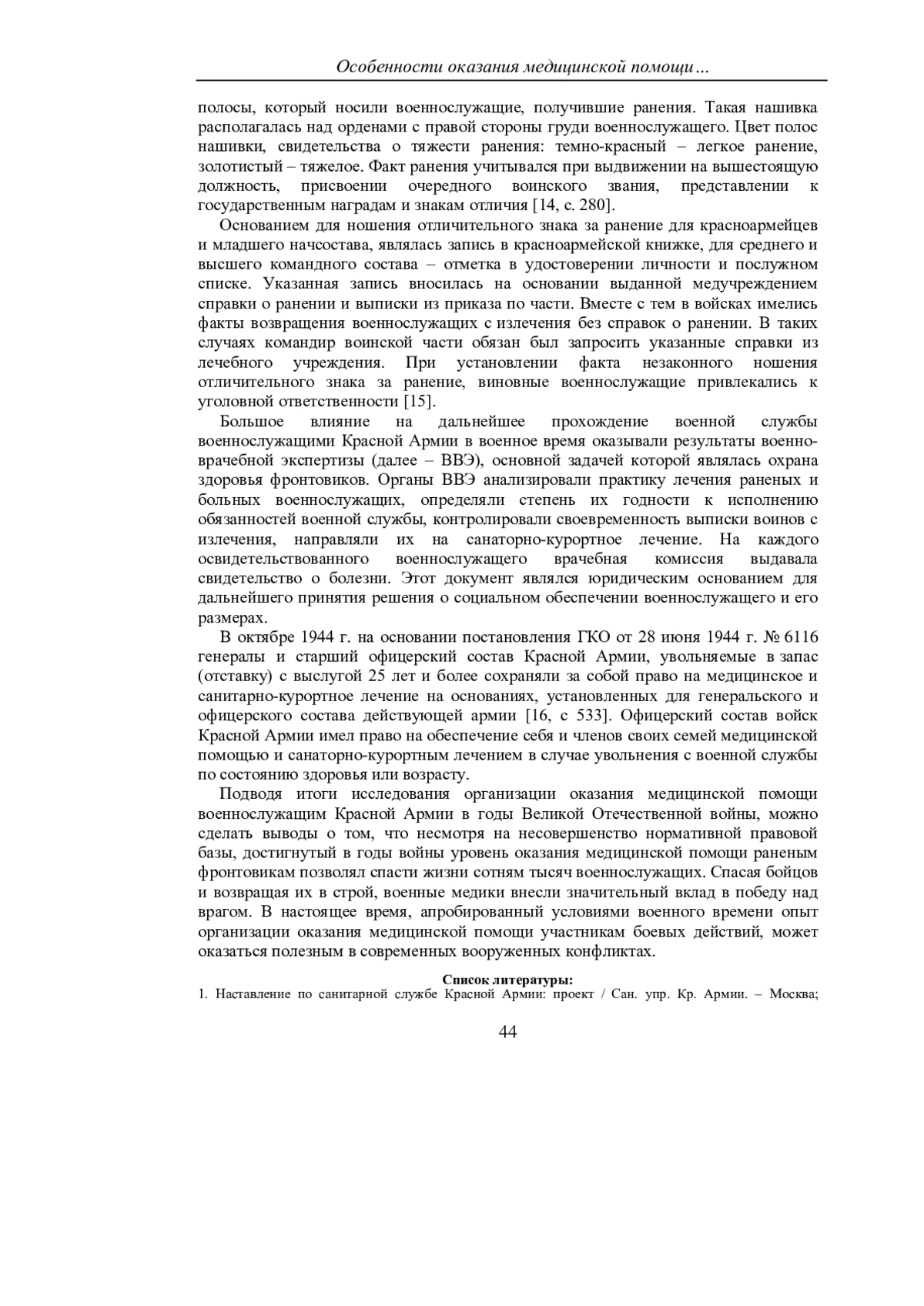 14. Лысенков С. Г. Организация медицинской помощи военнослужащим Красной Армии в период Великой Отечественной войны / С. Г. Лысенков // Genesis: исторические исследования, 2016. - № 3. -С. 260-282.