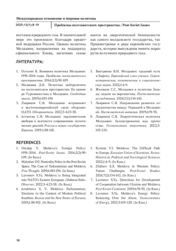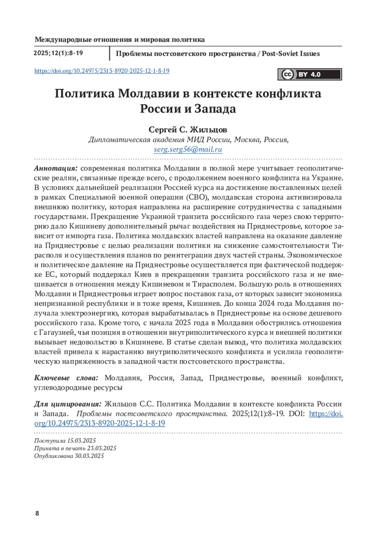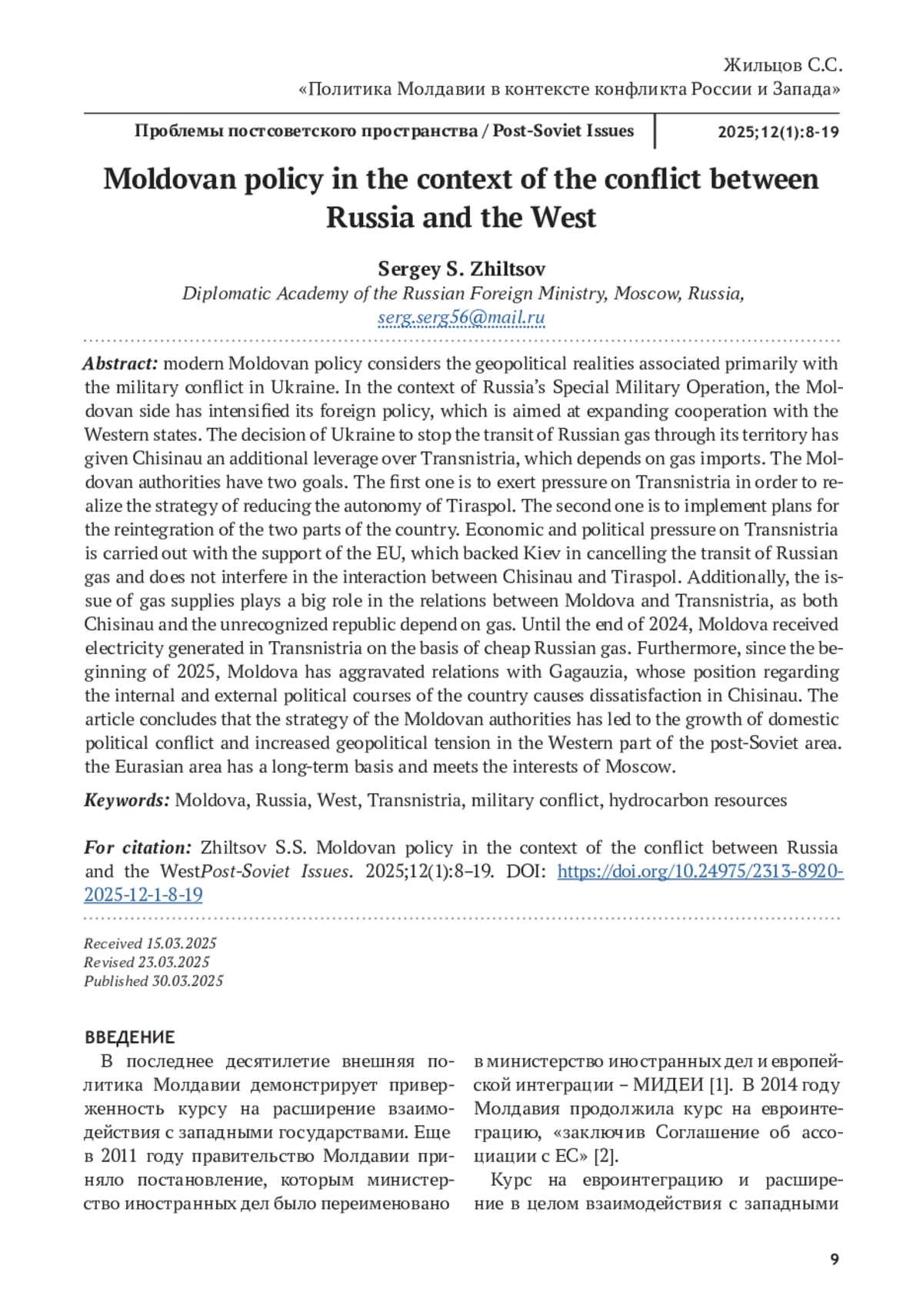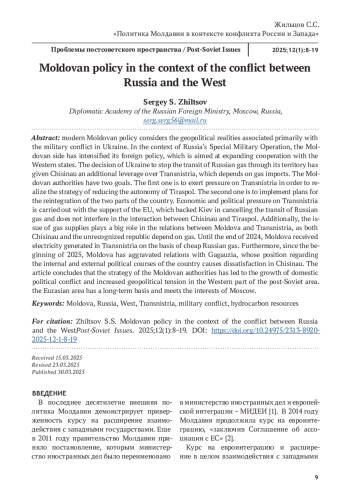 Современная политика Молдавии в полной мере учитывает геополитические реалии, связанные прежде всего, с продолжением военного конфликта на Украине. В условиях дальнейшей реализации Россией курса на достижение поставленных целей в рамках Специальной военной операции (СВО), молдавская сторона активизировала внешнюю политику, которая направлена на расширение сотрудничества с западными государствами. Прекращение Украиной транзита российского газа через свою территорию дало Кишиневу дополнительный рычаг воздействия на Приднестровье, которое зависит от импорта газа. Политика молдавских властей направлена на оказание давление на Приднестровье с целью реализации политики на снижение самостоятельности Тирасполя и осуществления планов по реинтеграции двух частей страны. Экономическое и политическое давление на Приднестровье осуществляется при фактической поддержке ЕС, который поддержал Киев в прекращении транзита российского газа и не вмешивается в отношения между Кишиневом и Тирасполем. Большую роль в отношениях Молдавии и Приднестровья играет вопрос поставок газа, от которых зависит экономика непризнанной республики и в тоже время, Кишинев. До конца 2024 года Молдавия получала электроэнергию, которая вырабатывалась в Приднестровье на основе дешевого российского газа. Кроме того, с начала 2025 года в Молдавии обострились отношения с Гагаузией, чья позиция в отношении внутриполитического курса и внешней политики вызывает недовольство в Кишиневе. В статье сделан вывод, что политика молдавских властей привела к нарастанию внутриполитического конфликта и усилила геополитическую напряженность в западной части постсоветского пространства.