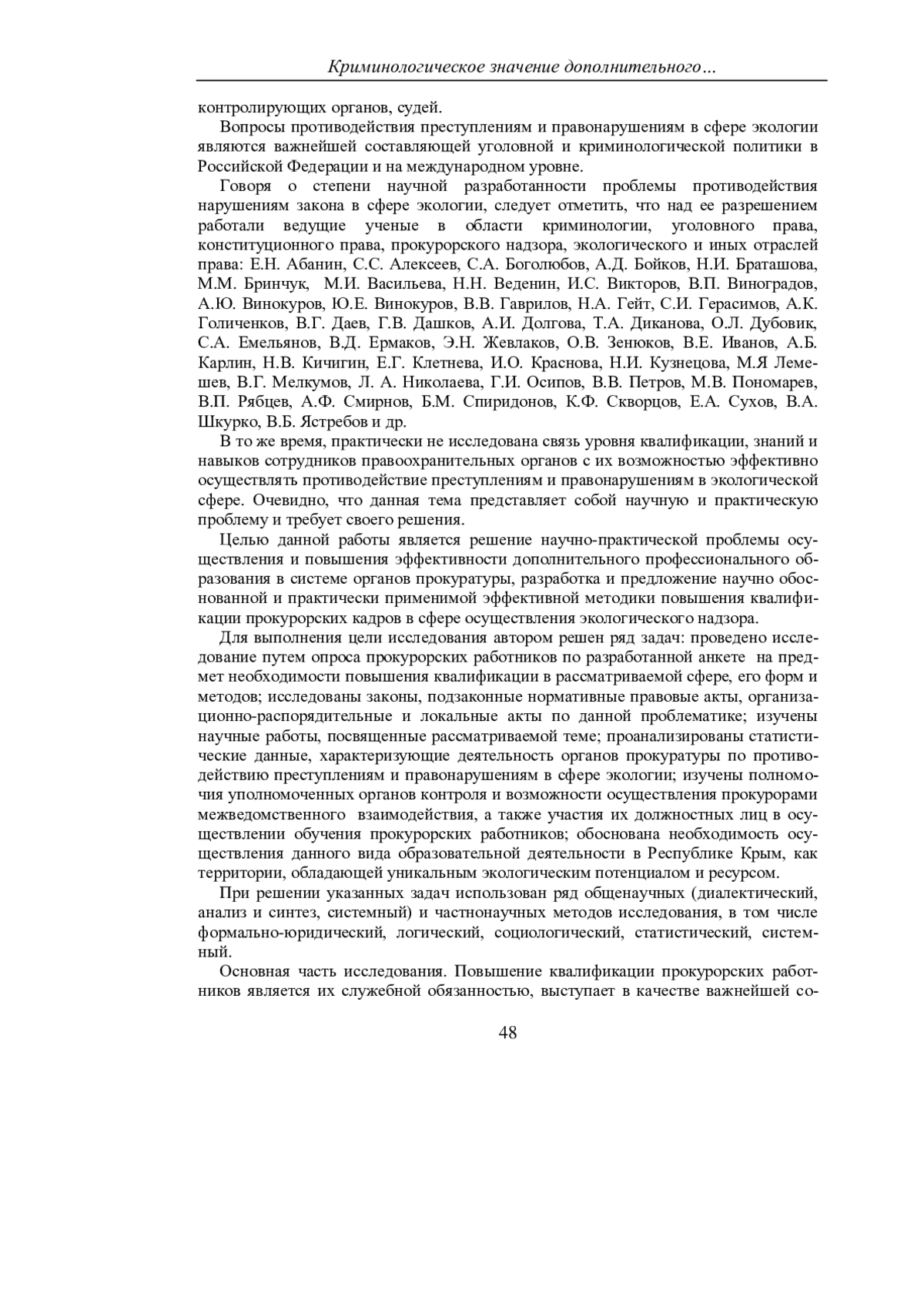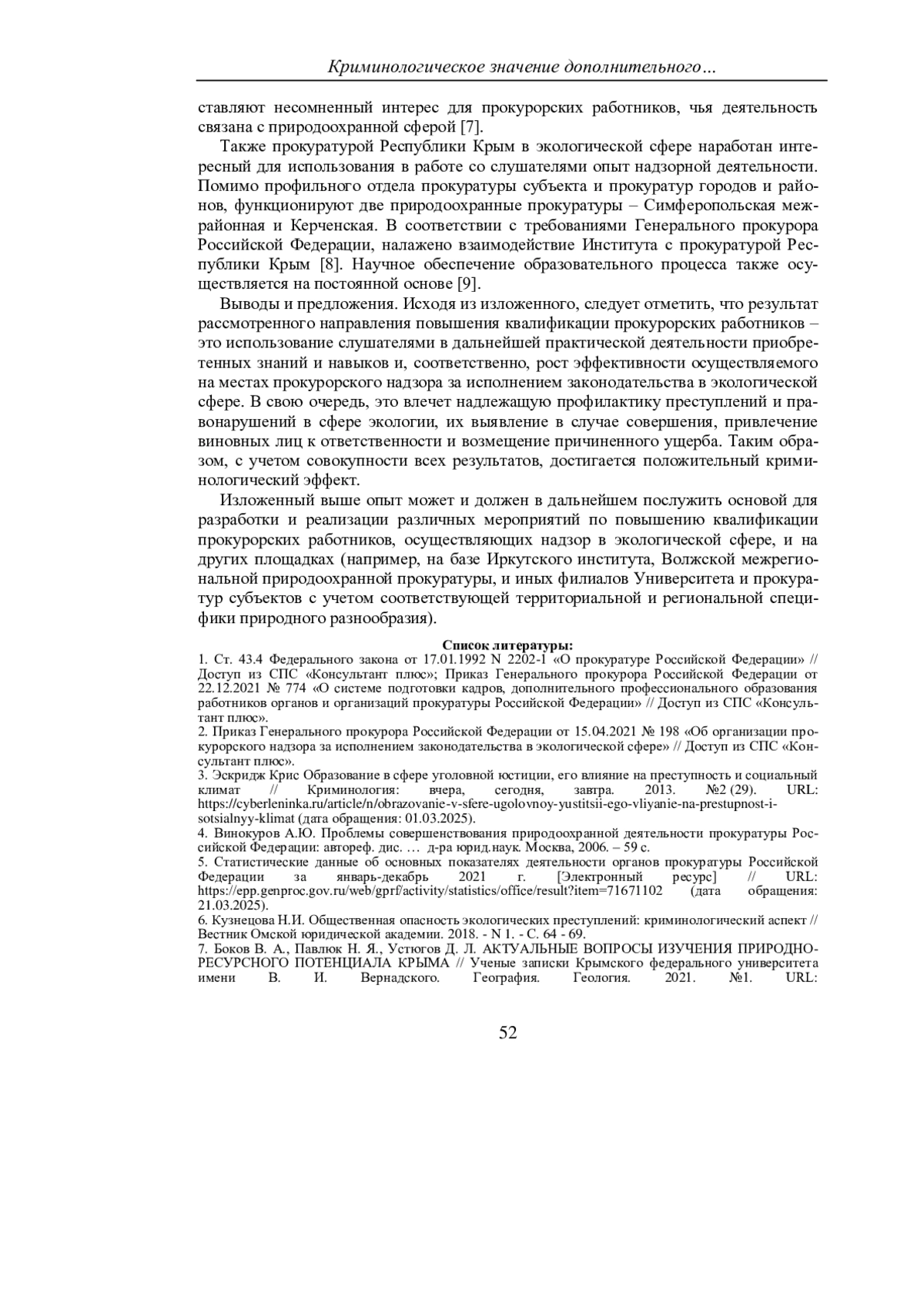 9. Совершенствование дополнительного профессионального образования прокурорских работников в экологической сфере как фактор укрепления законности. Организация прокурорской деятельности: традиции и инновации (Сухаревские чтения): сб. материалов IX Всерос. науч.-практ. конф. (г. Москва, 6 окт. 2023 г.); Ун-т прокуратуры Рос. Федерации. - М., 2024. - С. 88-92.