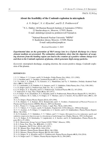 8. Долгов А. Н., Земченкова Н. В., Клячин Н. А., Прохорович Д. Е. // Физика плазмы. 2011. Т. 37. № 3. С. 194.
