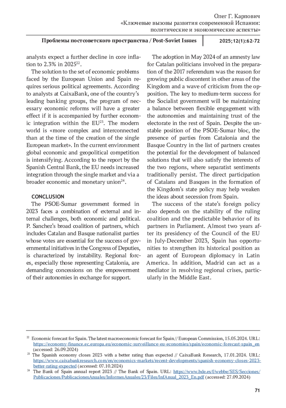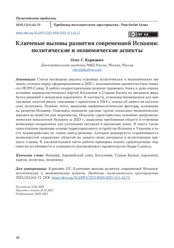 Статья посвящена анализу основных политических и экономических вызовов, стоящих перед сформированным в 2023 г. коалиционным правительством левых сил ИСРП-Сумар. В работе охарактеризованы позиции правящего блока и дана оценка влиянию националистических партий Каталонии и Страны Басков на механизм выработки решений в испанском парламенте. В частности, отмечены появившиеся для центральных властей риски, связанные с принятием в 2024 г. закона об амнистии каталонских политиков. Помимо этого, выявлены внешнеполитические факторы, влияющие на развитие Испании. Отдельное внимание уделено группе социально-экономических вызовов на повестке дня королевства. Показана характеристика основных макроэкономических показателей Испании за 2023 г., выделены проблемные области и отмечены возможные направления для улучшения ситуации в кризисных зонах. В тексте также сопоставлены правовые основы территориального устройства Испании и Украины в части взаимодействия по линии центр-регионы. Автором подчеркнута ограниченность возможностей украинских областей по защите своих интересов в политическом процессе страны. В заключительной части работы приведена оценка среднесрочных перспектив устойчивости и успешности коалиционного правительства Педро Санчеса.