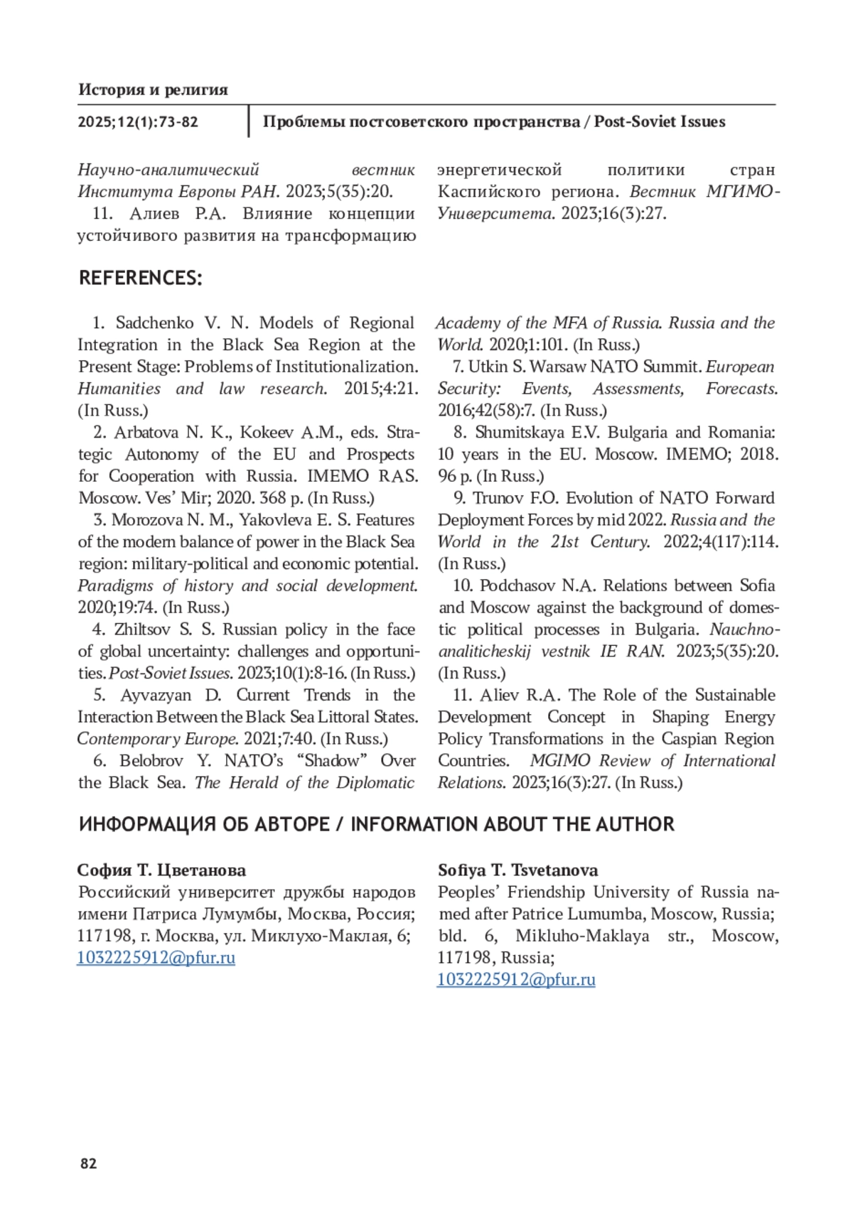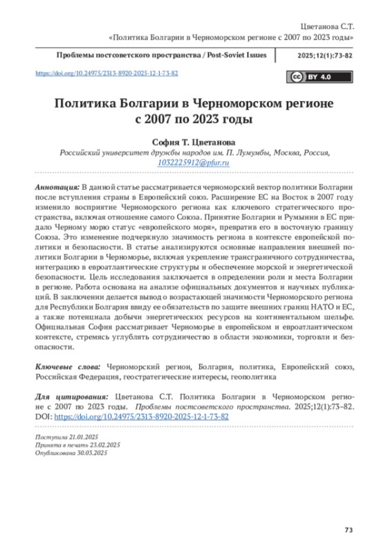 В данной статье рассматривается черноморский вектор политики Болгарии после вступления страны в Европейский союз. Расширение ЕС на Восток в 2007 году изменило восприятие Черноморского региона как ключевого стратегического пространства, включая отношение самого Союза. Принятие Болгарии и Румынии в ЕС придало Черному морю статус «европейского моря», превратив его в восточную границу Союза. Это изменение подчеркнуло значимость региона в контексте европейской политики и безопасности. В статье анализируются основные направления внешней политики Болгарии в Черноморье, включая укрепление трансграничного сотрудничества, интеграцию в евроатлантические структуры и обеспечение морской и энергетической безопасности. Цель исследования заключается в определении роли и места Болгарии в регионе. Работа основана на анализе официальных документов и научных публикаций. В заключении делается вывод о возрастающей значимости Черноморского региона для Республики Болгария ввиду ее обязательств по защите внешних границ НАТО и ЕС, а также потенциала добычи энергетических ресурсов на континентальном шельфе. Официальная София рассматривает Черноморье в европейском и евроатлантическом контексте, стремясь углублять сотрудничество в области экономики, торговли и безопасности.