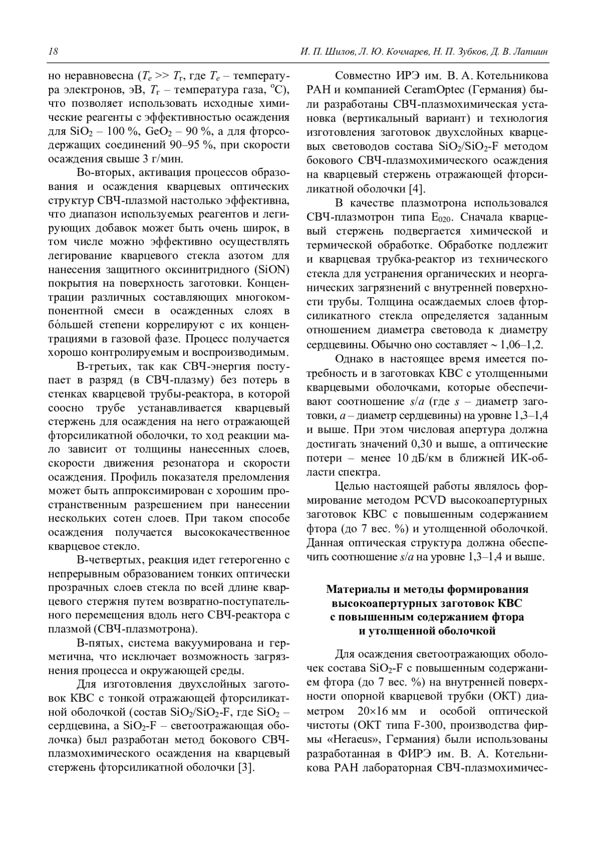 Приведены результаты экспериментальных исследований по получению высокоапертурных заготовок кварцевых волоконных световодов с повышенным содержанием фтора (до 7 вес. %) и утолщенной оболочкой на основе кварцевого стекла, легированного фтором, при помощи неизотермической плазмы резонансного локального СВЧразряда (PCVD-метод). Достигнуты высокие скорости осаждения слоев кварцевого стекла, легированного фтором (вплоть до 3 мкм/мин), и соотношения s/a (где s – диаметр заготовки, a – диаметр сердцевины) на уровне 1,3–1,4 и выше.