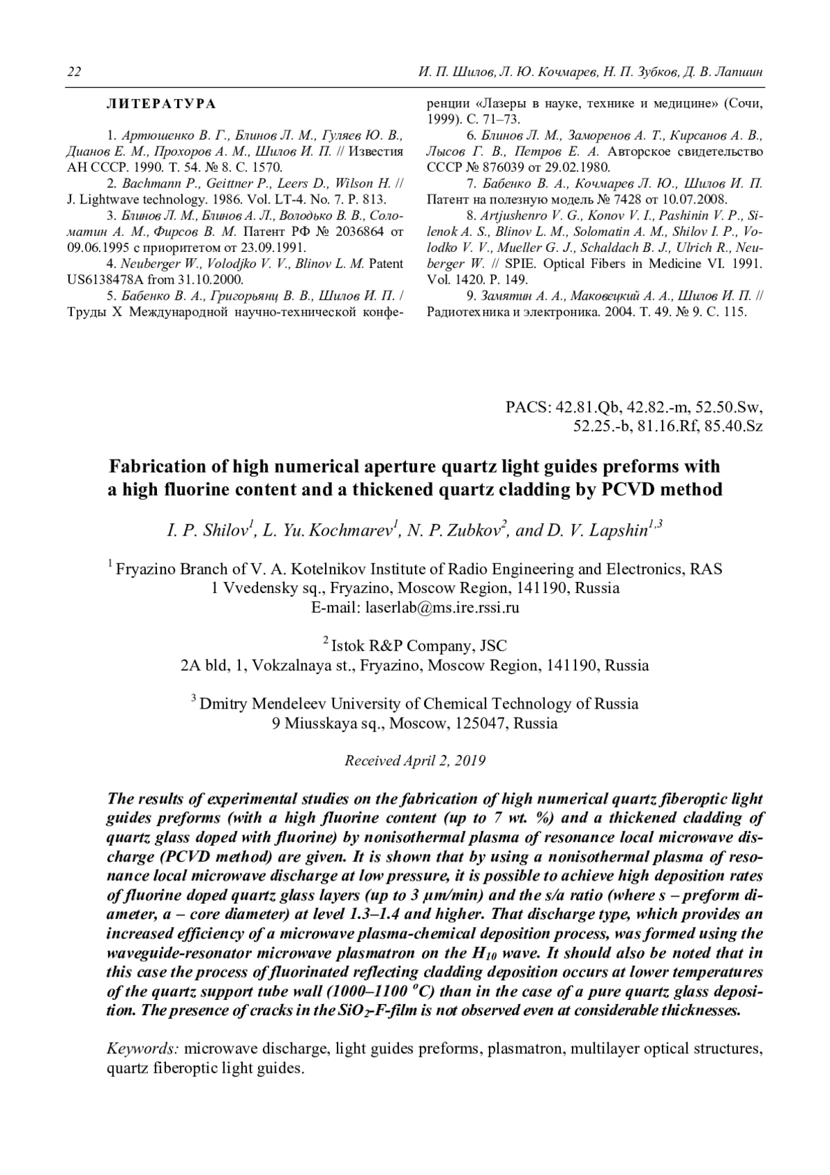 The results of experimental studies on the fabrication of high numerical quartz fiberoptic light guides preforms (with a high fluorine content (up to 7 wt. %) and a thickened cladding of quartz glass doped with fluorine) by nonisothermal plasma of resonance local microwave discharge (PCVD method) are given. It is shown that by using a nonisothermal plasma of resonance local microwave discharge at low pressure, it is possible to achieve high deposition rates of fluorine doped quartz glass layers (up to 3 μm/min) and the s/a ratio (where s – preform diameter, a – core diameter) at level 1.3–1.4 and higher. That discharge type, which provides an increased efficiency of a microwave plasma-chemical deposition process, was formed using the waveguide-resonator microwave plasmatron on the H10 wave. It should also be noted that in this case the process of fluorinated reflecting cladding deposition occurs at lower temperatures of the quartz support tube wall (1000–1100 oС) than in the case of a pure quartz glass deposition. The presence of cracks in the SiO2-F-film is not observed even at considerable thicknesses.