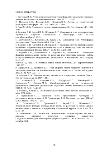 1. Дьяченко В.В., Чартий П.В., Чартий Р.П., Шеманин В.Г. Контроль аэрозолей в приземном слое атмосферы в реальном времени // Безопасность в техносфере. 2008. № 3. С. 36-43.