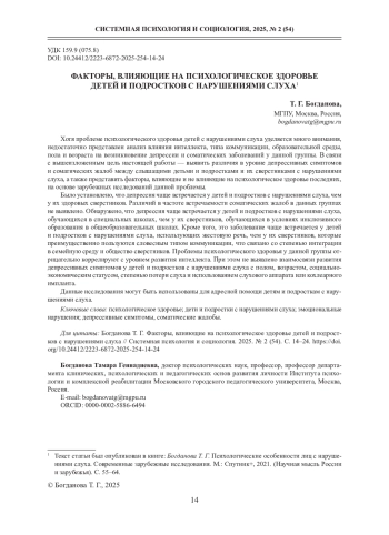 Хотя проблеме психологического здоровья детей с нарушениями слуха уделяется много внимания, недостаточно представлен анализ влияния интеллекта, типа коммуникации, образовательной среды, пола и возраста на возникновение депрессии и соматических заболеваний у данной группы. В связи с вышеизложенным цель настоящей работы - выявить различия в уровне депрессивных симптомов и соматических жалоб между слышащими детьми и подростками и их сверстниками с нарушениями слуха, а также представить факторы, влияющие и не влияющие на психологическое здоровье последних, на основе зарубежных исследований данной проблемы.
