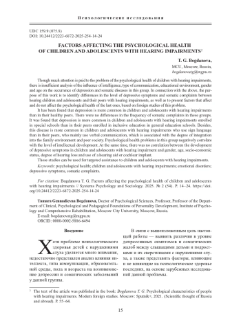 Хотя проблеме психологического здоровья детей с нарушениями слуха уделяется много внимания, недостаточно представлен анализ влияния интеллекта, типа коммуникации, образовательной среды, пола и возраста на возникновение депрессии и соматических заболеваний у данной группы.