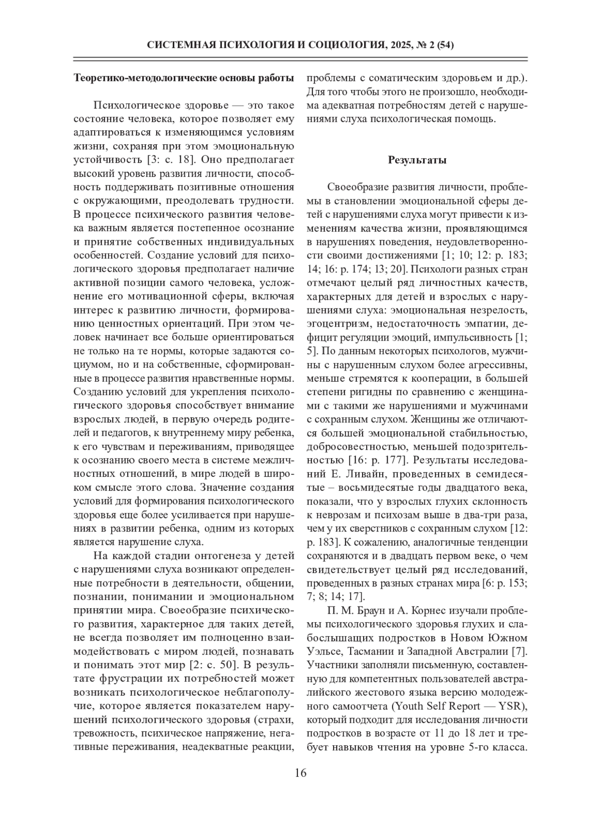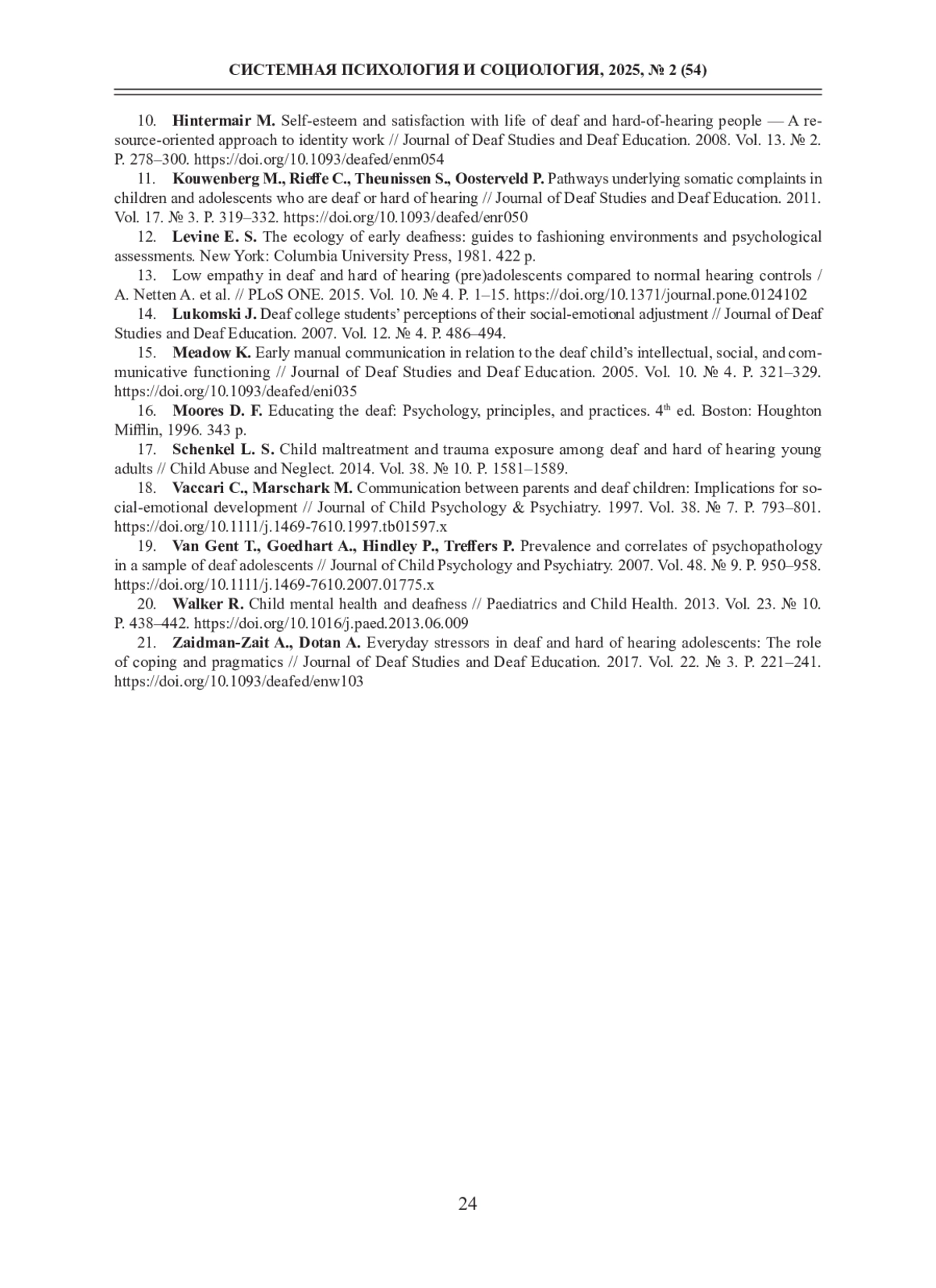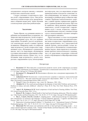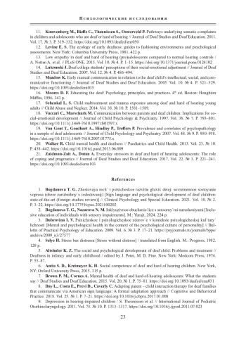 19. Van Gent T., Goedhart A., Hindley P., Treffers P. Prevalence and correlates of psychopathology in a sample of deaf adolescents // Journal of Child Psychology and Psychiatry. 2007. Vol. 48. № 9. P. 950-958. DOI: 10.1111/j.1469-7610.2007.01775.x