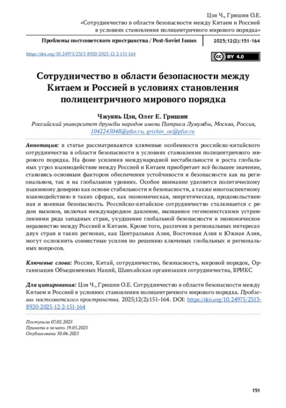 В статье рассматриваются ключевые особенности российско-китайского сотрудничества в области безопасности в условиях становления полицентричного мирового порядка. На фоне усиления международной нестабильности и роста глобальных угроз взаимодействие между Россией и Китаем приобретает всё большее значение, становясь основным фактором обеспечения устойчивости и безопасности как на региональном, так и на глобальном уровнях. Особое внимание уделяется политическому взаимному доверию как основе стабильности и безопасности, а также многоаспектному взаимодействию в таких сферах, как экономическая, энергетическая, продовольственная и военная безопасность. Российско-китайское сотрудничество сталкивается с рядом вызовов, включая международное давление, вызванное гегемонистскими устремлениями ряда западных стран, ухудшение глобальной безопасности и экономическое неравенство между Россией и Китаем. Кроме того, различия в региональных интересах двух стран в таких регионах, как Центральная Азия, Восточная Азия и Южная Азия, могут осложнить совместные усилия по решению ключевых глобальных и региональных вопросов.