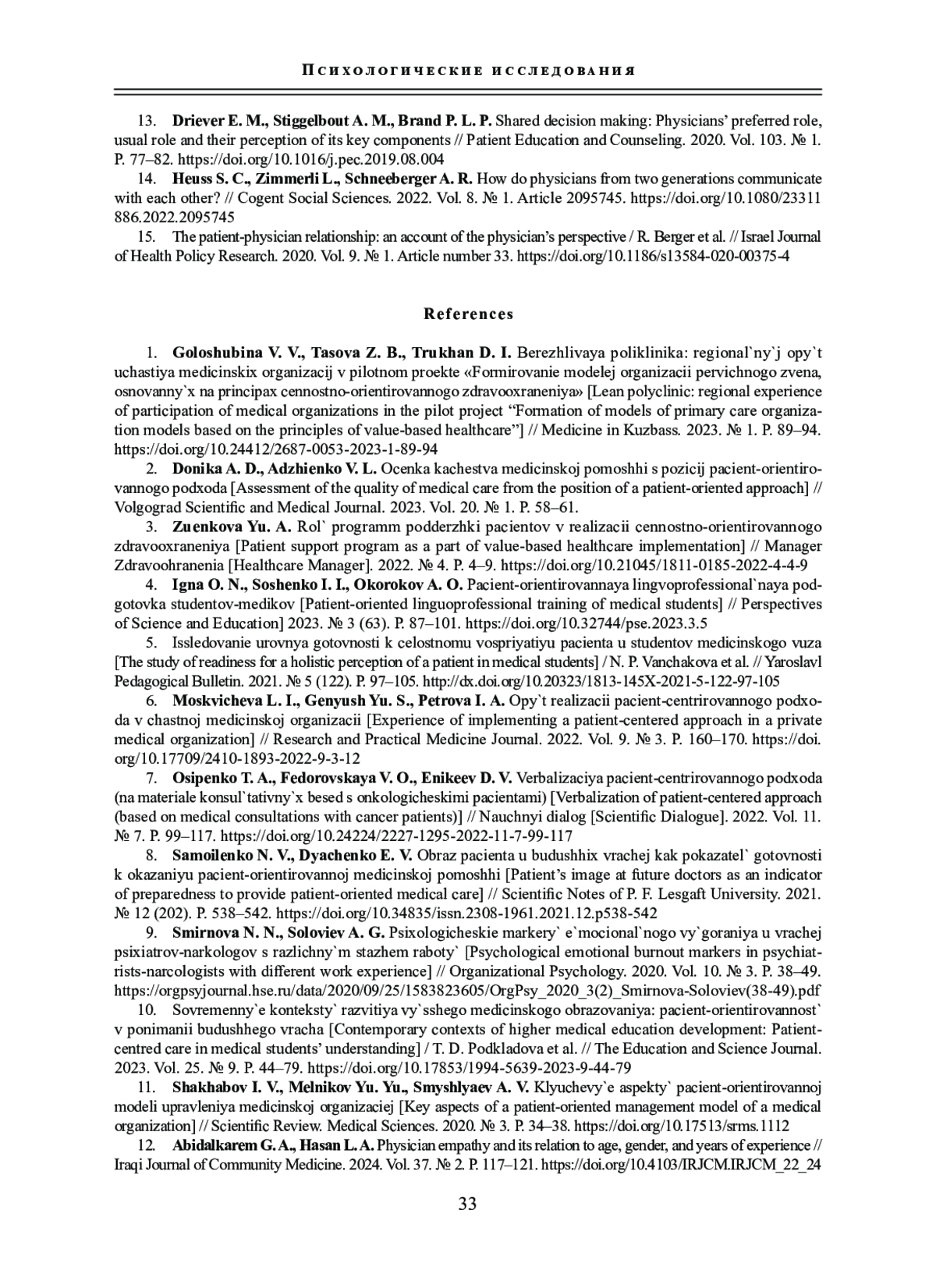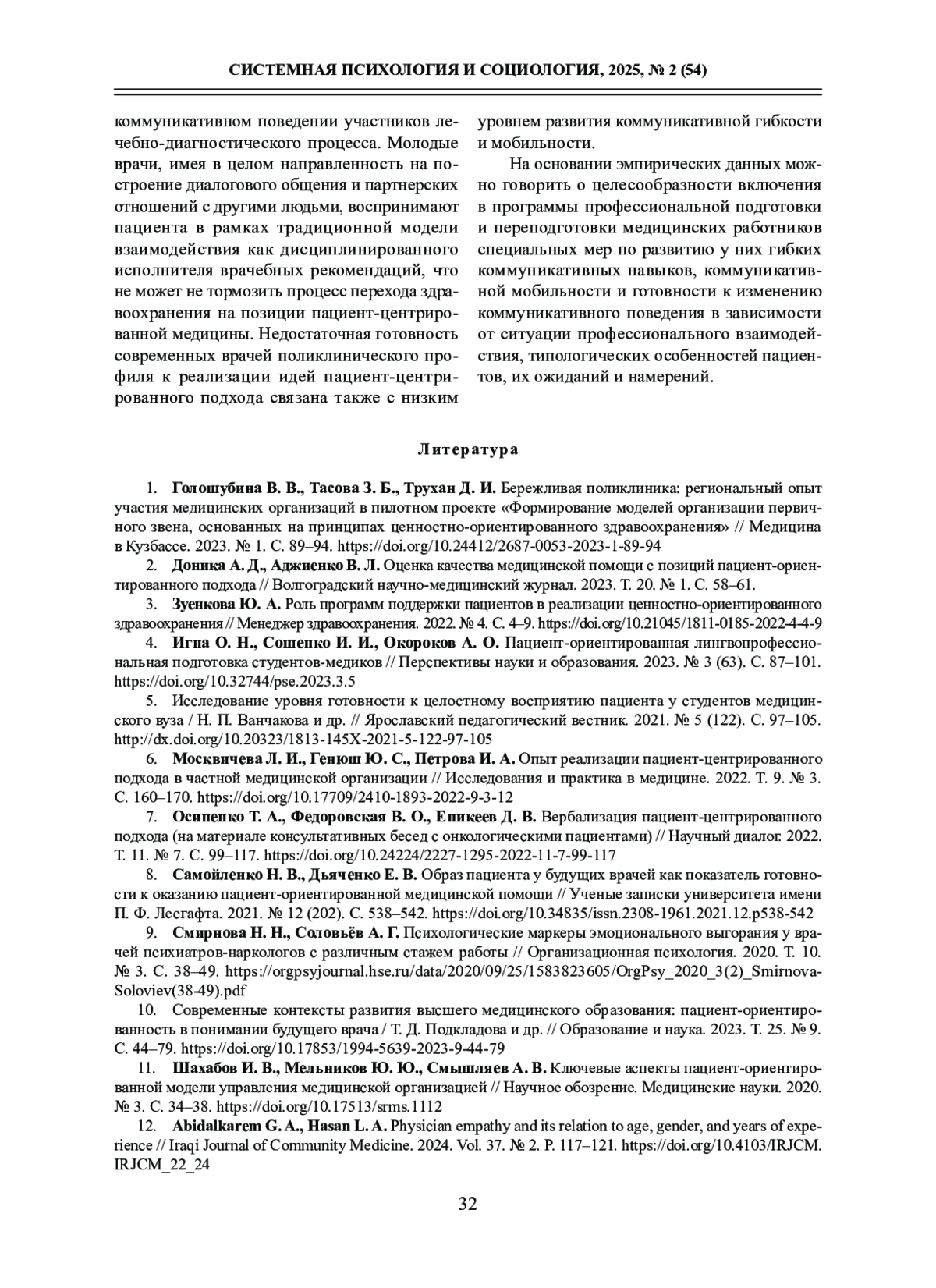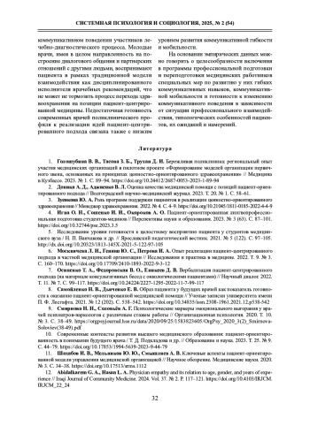 ШОМАХОВА А. М., БОНКАЛО Т. И. ОСОБЕННОСТИ СИСТЕМЫ ПРЕДСТАВЛЕНИЙ ОБ ИДЕАЛЬНОЙ МОДЕЛИ ВЗАИМОДЕЙСТВИЯ С ПАЦИЕНТАМИ У ВРАЧЕЙ С РАЗНЫМ СТАЖЕМ РАБОТЫ // СИСТЕМНАЯ ПСИХОЛОГИЯ И СОЦИОЛОГИЯ. 2025. № 2 (54)