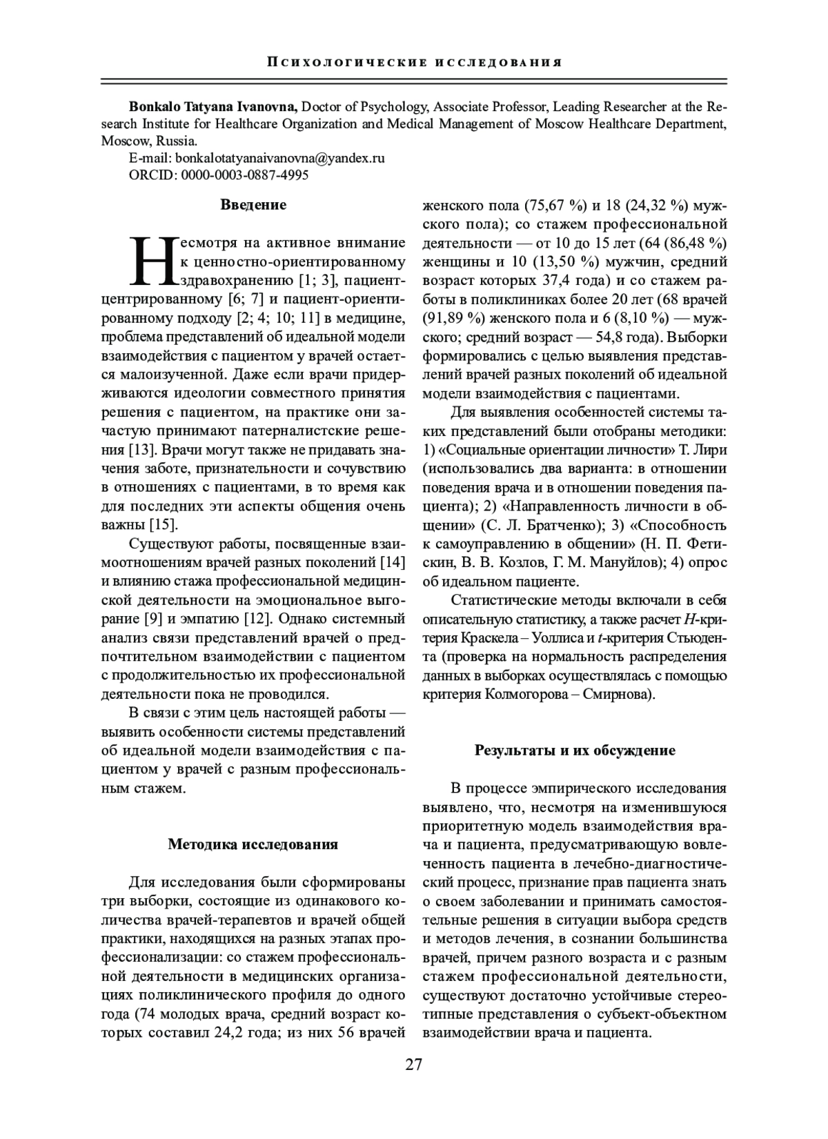 В исследовании приняли участие 222 врача-терапевта и врача общей практики, которые были разделены на три равночисленные группы в зависимости от стажа профессиональной деятельности в медицинских организациях поликлинического профиля: по 74 врача со стажем до одного года, от 10 до 15 лет и более 20 лет. Исследование осуществлялось с помощью теста социальных ориентаций Т. Лири, ранжирования качеств личности пациентов по степени их приоритетности во взаимодействии с врачом, методики коммуникативной направленности С. Л. Братченко, методики «Способность к самоуправлению в общении» (Н. П. Фетискин и др.).