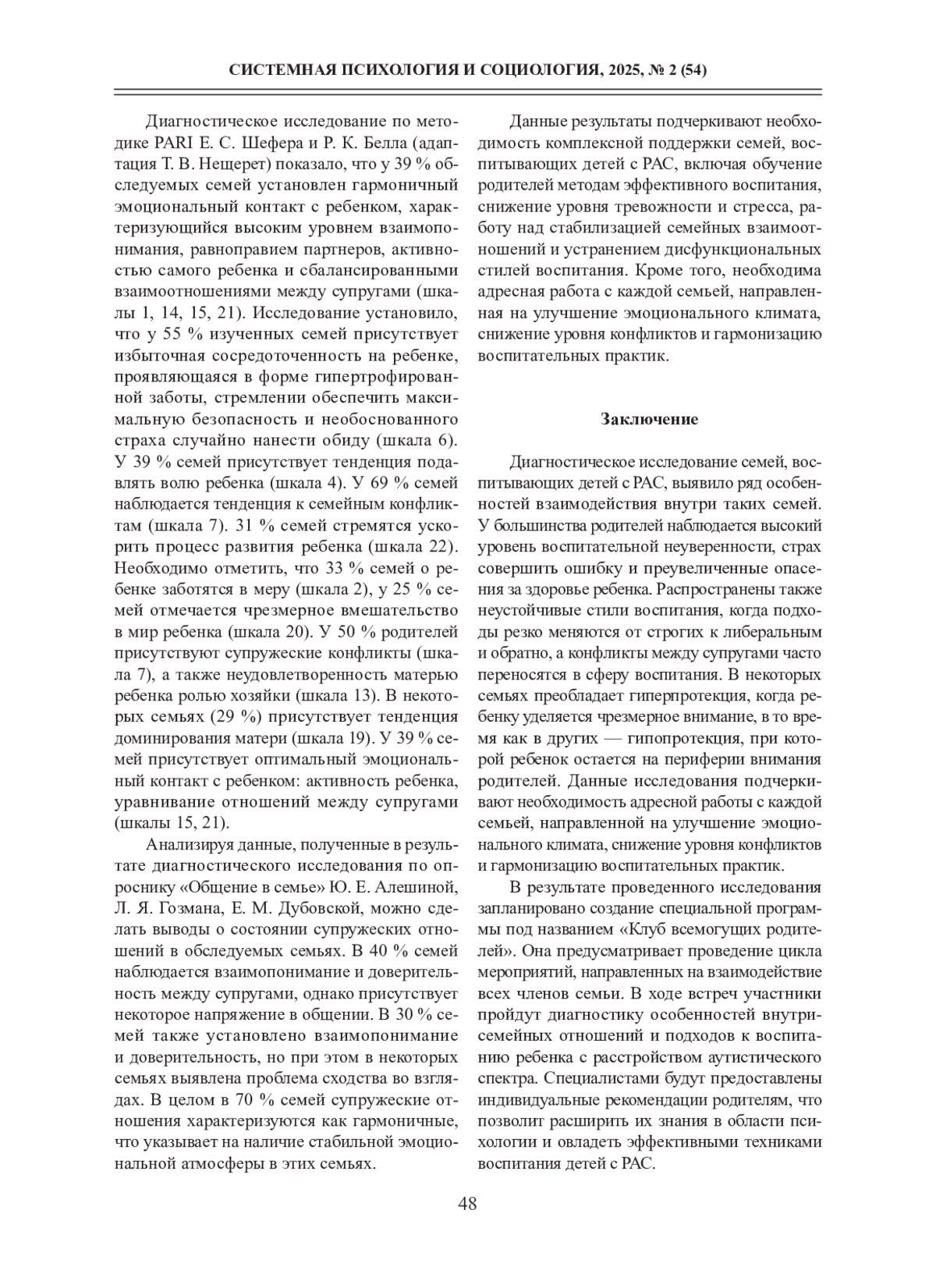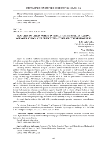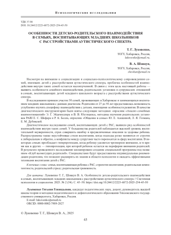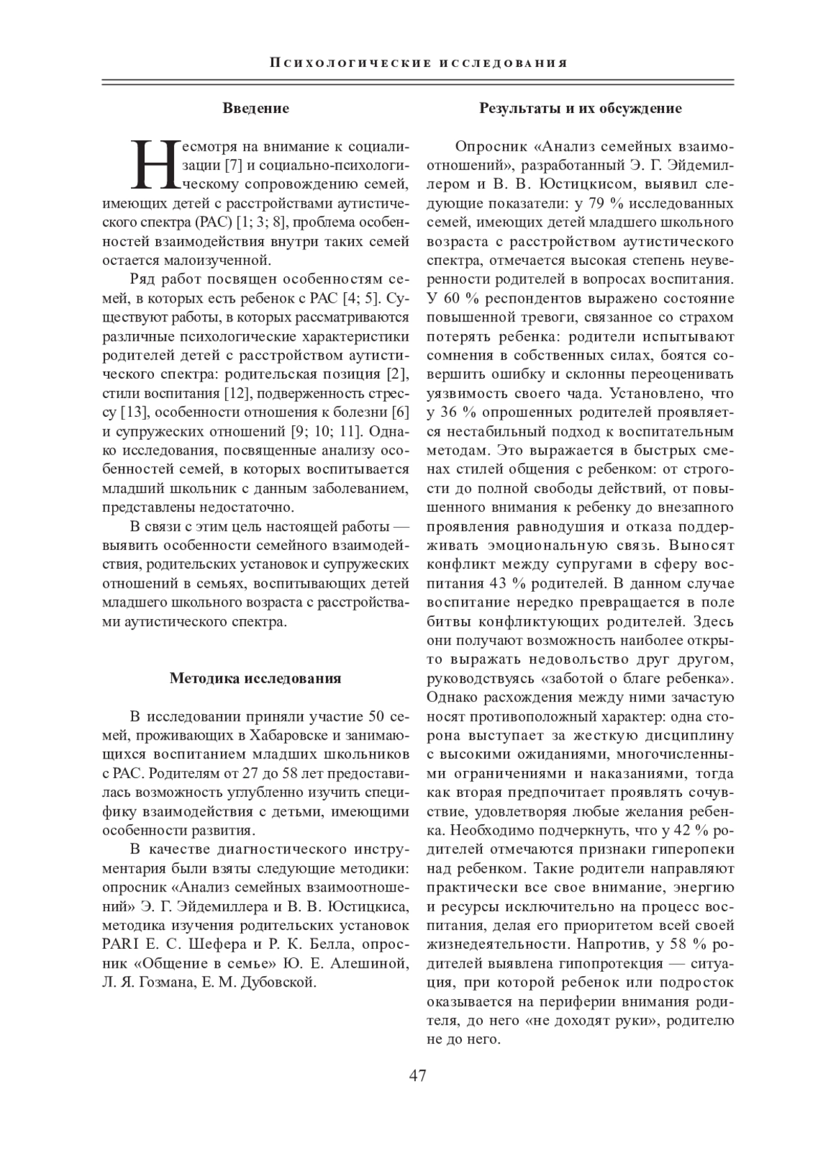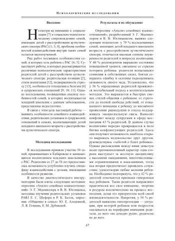 Несмотря на внимание к социализации [7] и социально-психологическому сопровождению семей, имеющих детей с расстройствами аутистического спектра (РАС) [1; 3; 8], проблема особенностей взаимодействия внутри таких семей остается малоизученной.