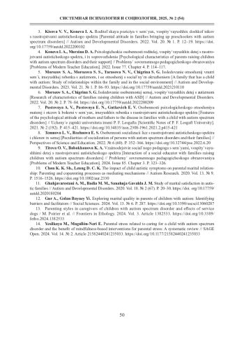 2. Кисова В. В., Конева И. А. Родительская позиция в семьях, воспитывающих дошкольников с расстройствами аутистического спектра // Аутизм и нарушения развития. 2022. Т. 20. № 1. С. 12-19. DOI: 10.17759/autdd.2022200102 EDN: BPPXHZ