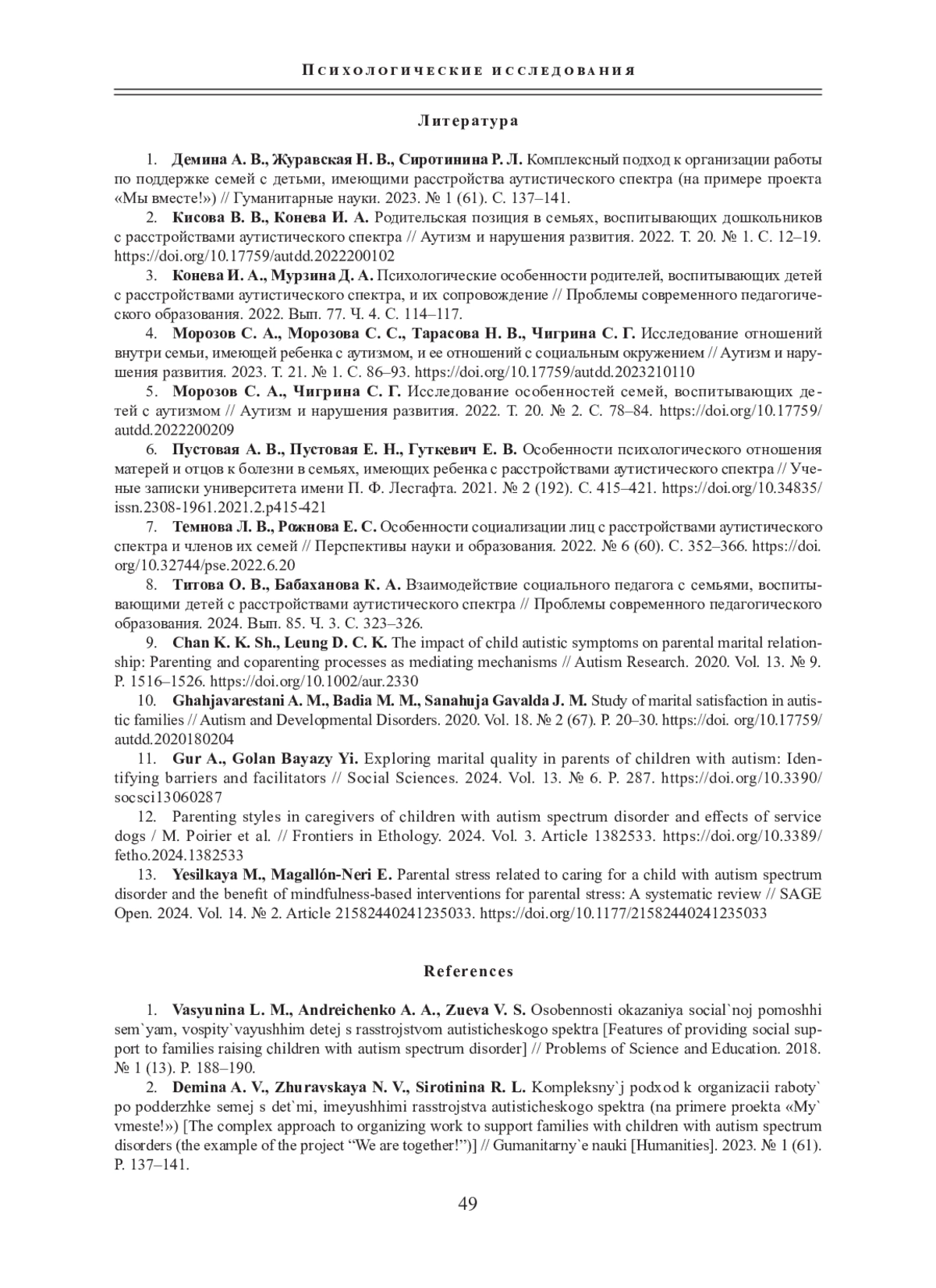 5. Морозов С. А., Чигрина С. Г. Исследование особенностей семей, воспитывающих детей с аутизмом // Аутизм и нарушения развития. 2022. Т. 20. № 2. С. 78-84. DOI: 10.17759/autdd.2022200209 EDN: RIKXFQ