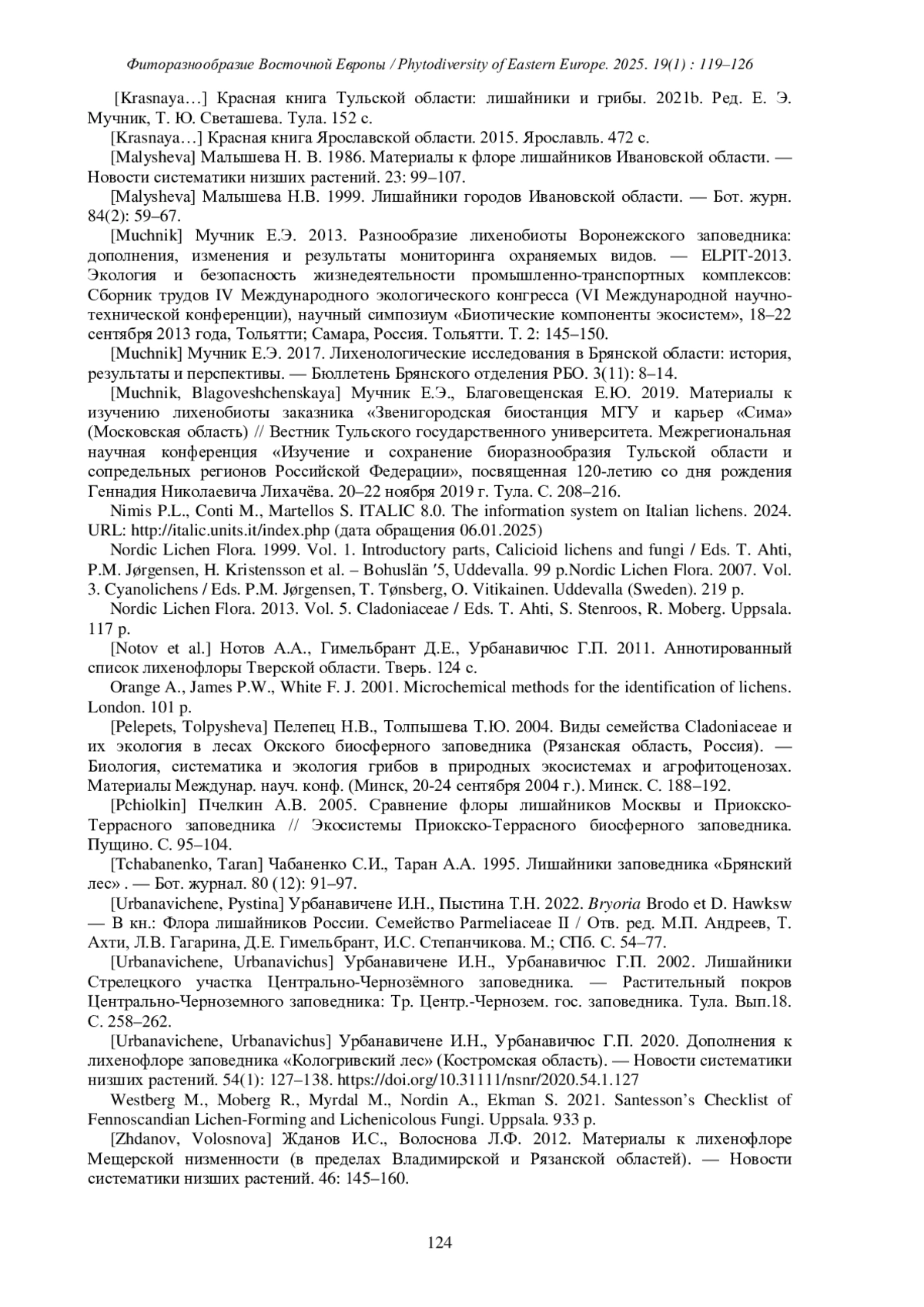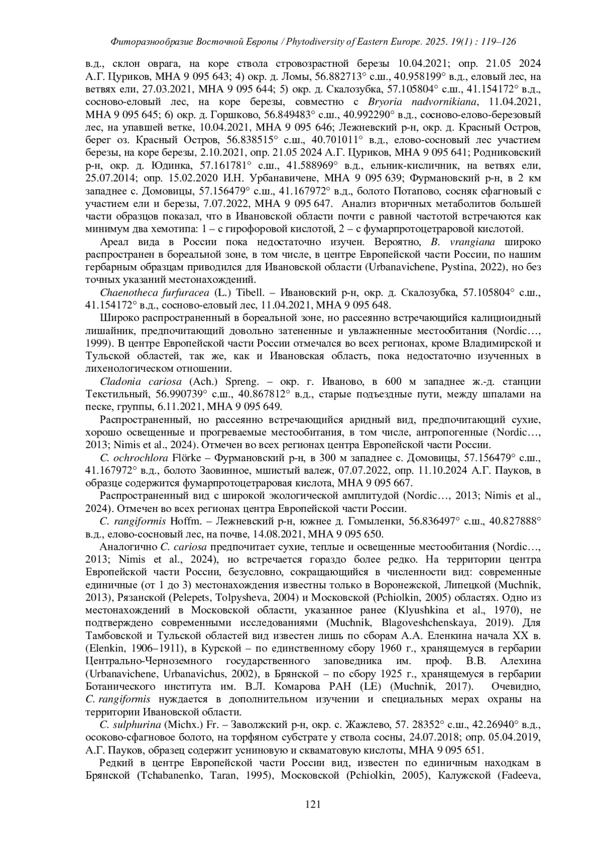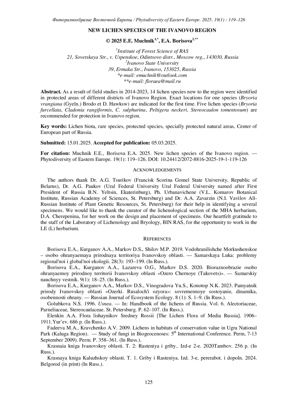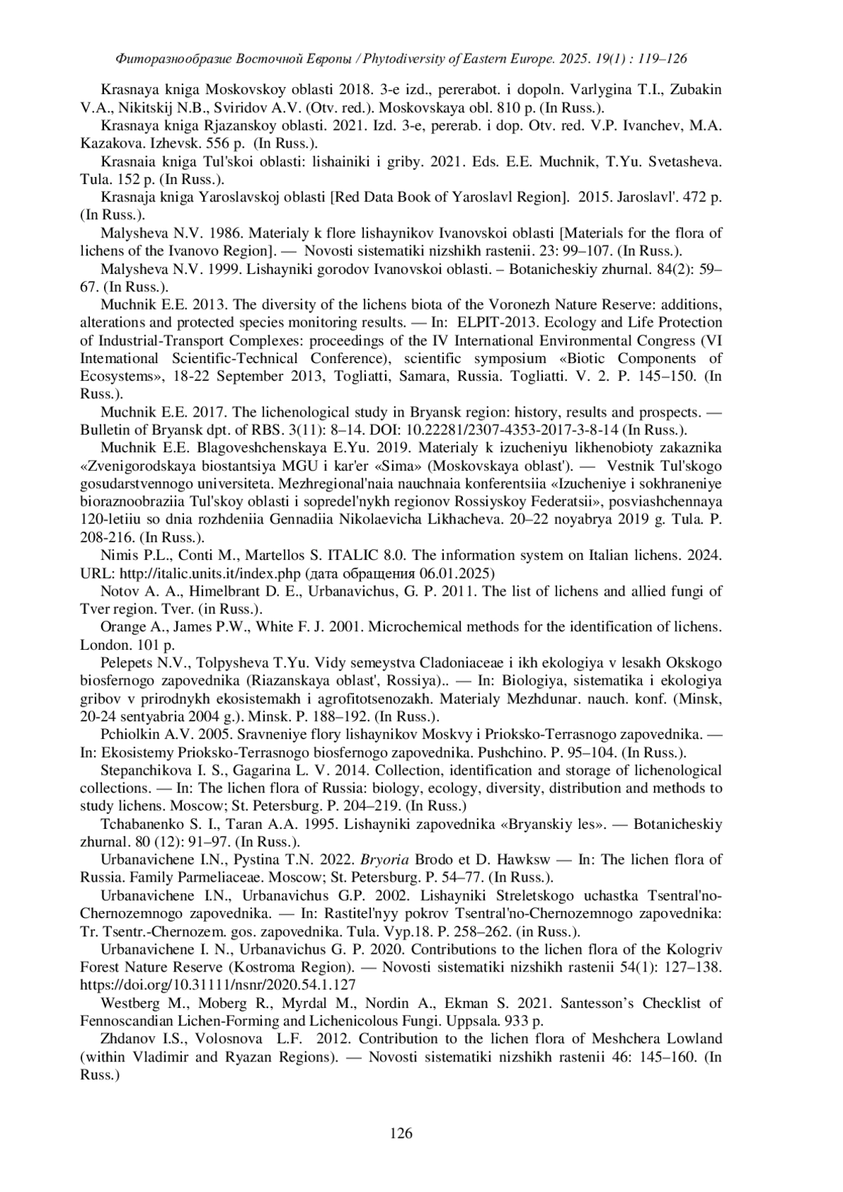 МУЧНИК Е. Э., БОРИСОВА Е. А. НОВЫЕ ВИДЫ ЛИШАЙНИКОВ ИВАНОВСКОЙ ОБЛАСТИ // ФИТОРАЗНООБРАЗИЕ ВОСТОЧНОЙ ЕВРОПЫ. 2025. Т. 19 № 1 (17 СТ.)