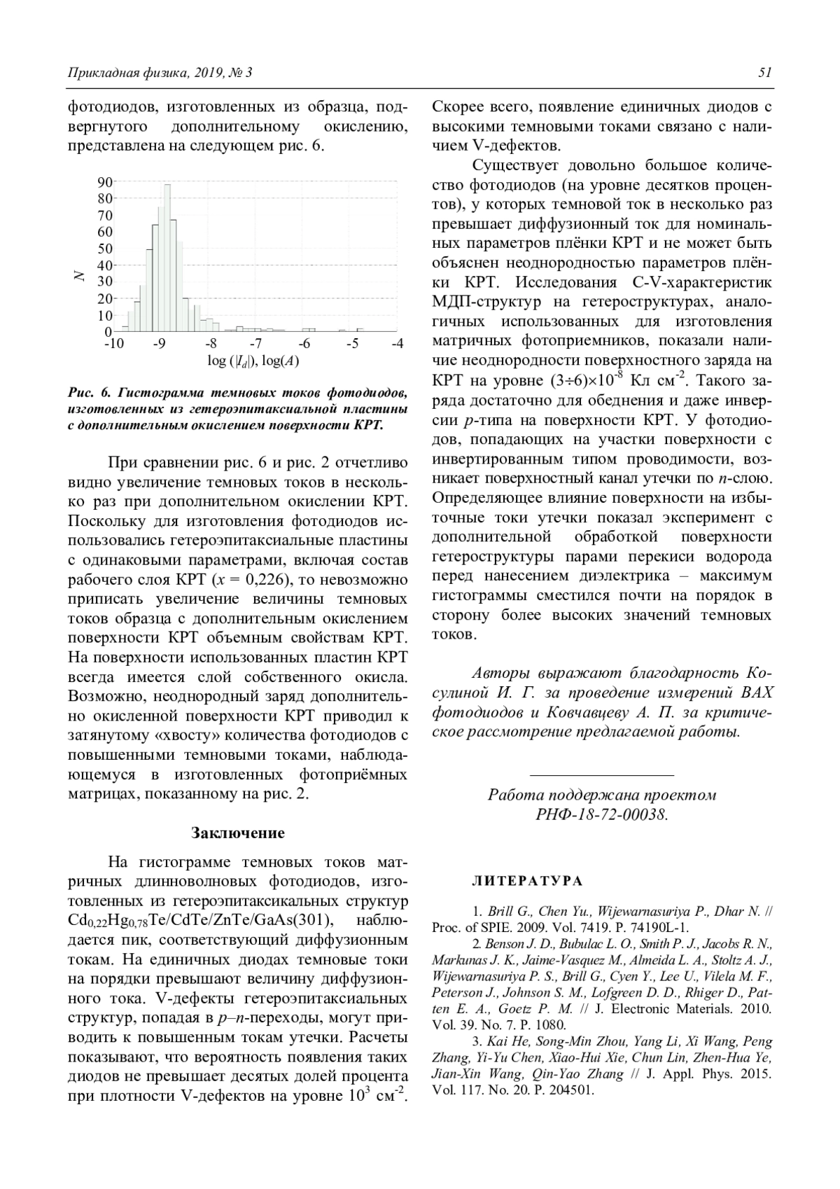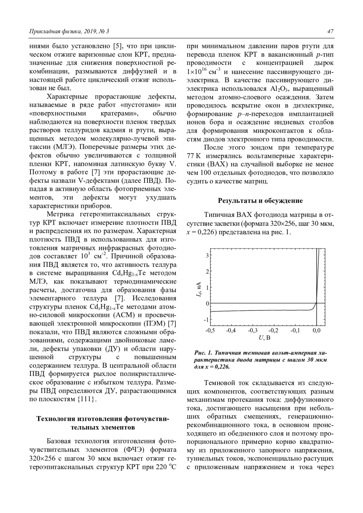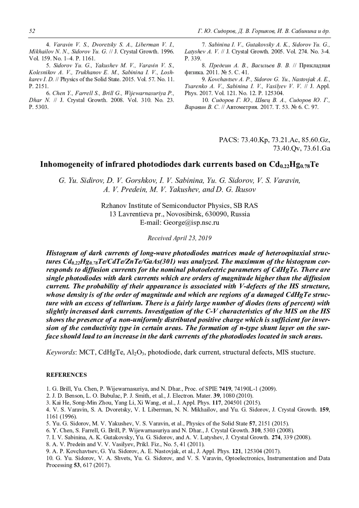 Сидоров Г. Ю., Горшков Д. В., Сабинина И. В., Сидоров Ю. Г., Варавин В. С., Предеин А. В., Якушев М. В., Икусов Д. Г. Неоднородность темновых токов инфракрасных фотодиодов на основе Cd0,22Hg0,78Te 45