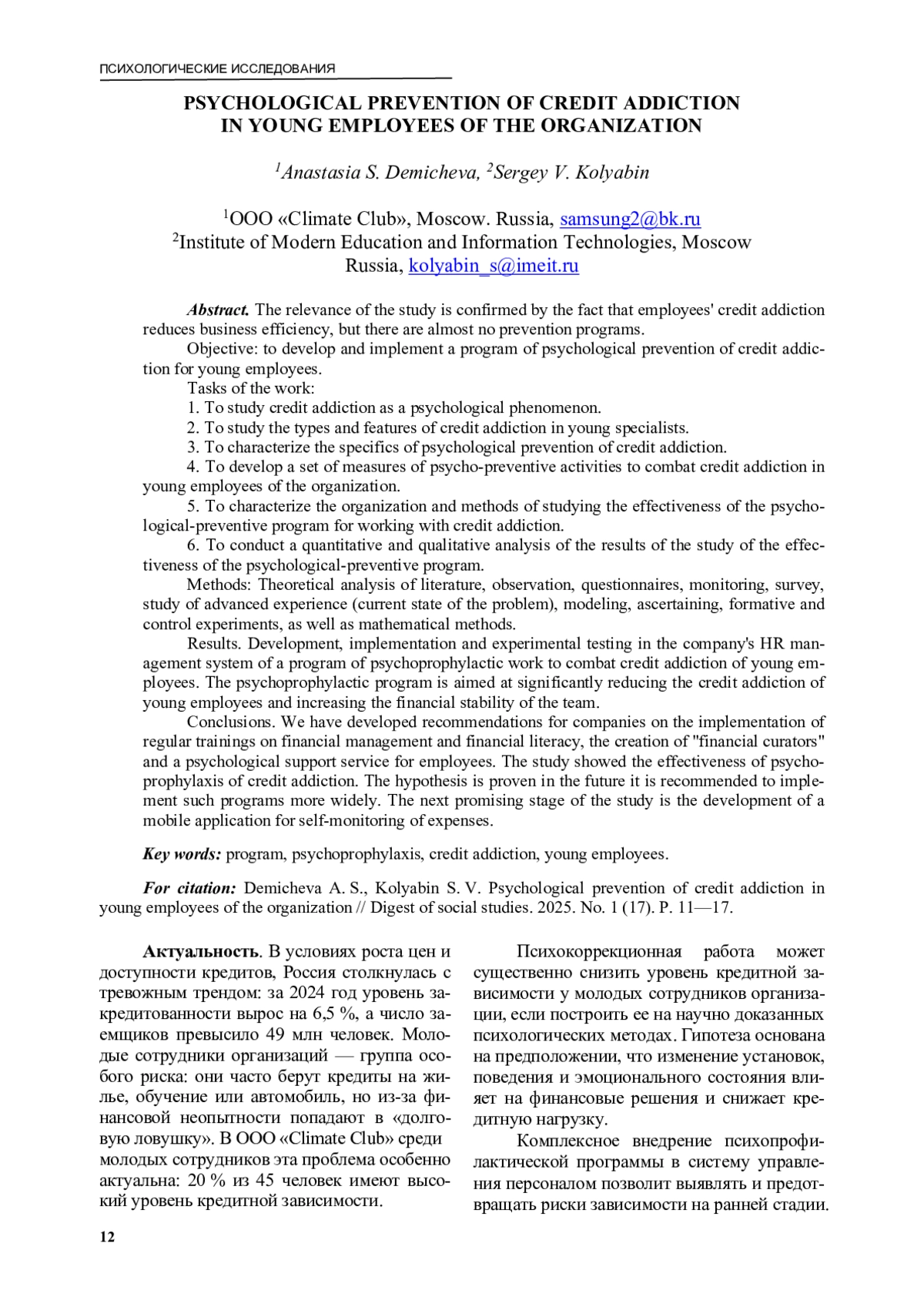 ДЕМИЧЕВА А. С., КОЛЯБИН С. В. ПСИХОЛОГИЧЕСКАЯ ПРОФИЛАКТИКА КРЕДИТНОЙ ЗАВИСИМОСТИ У МОЛОДЫХ СОТРУДНИКОВ ОРГАНИЗАЦИИ // ДАЙДЖЕСТ СОЦИАЛЬНЫХ ИССЛЕДОВАНИЙ. 2025. № 1 (17)