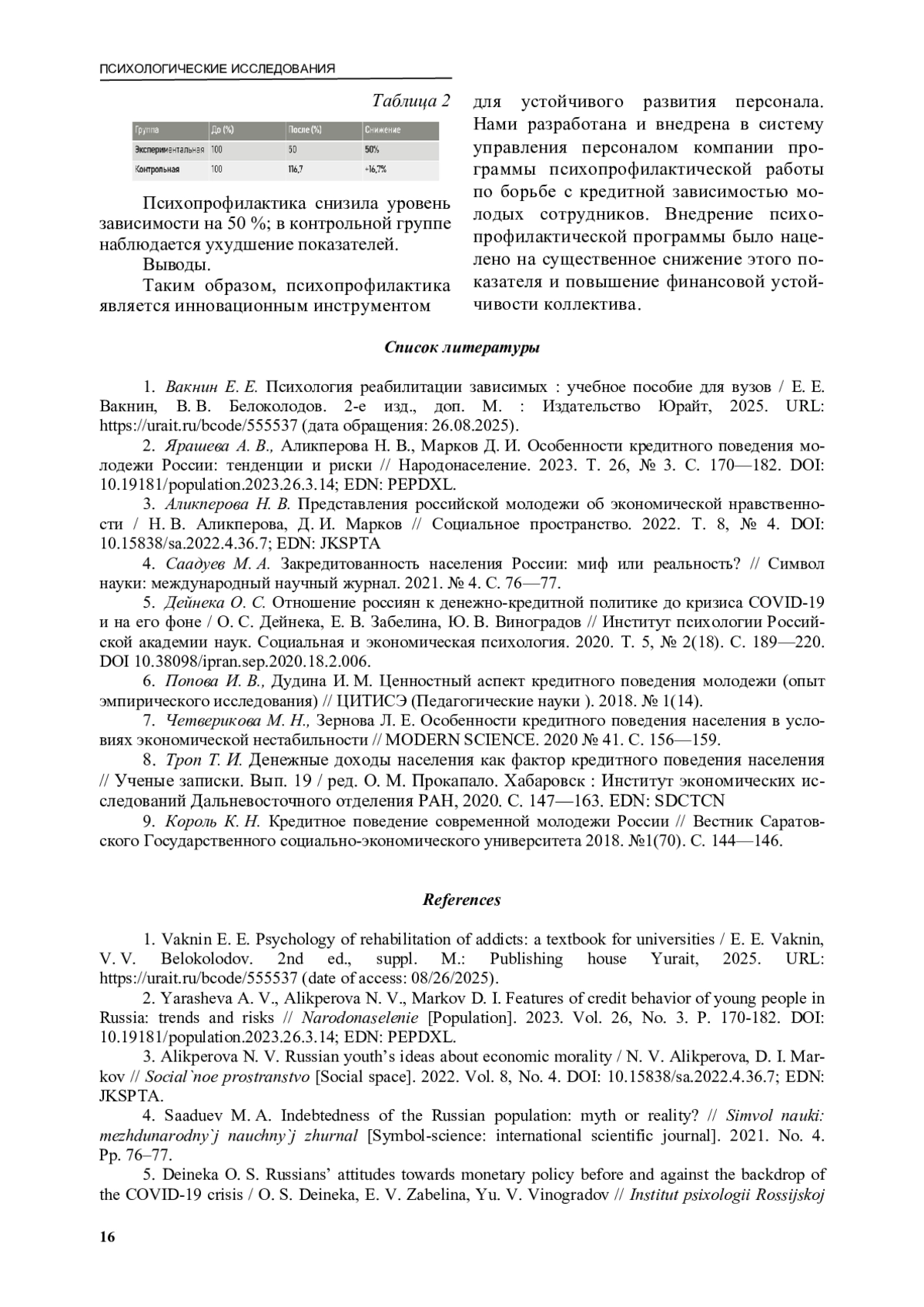 Выводы. Нами были разработаны рекомендации для компаний по внедрению регуляр-ных тренингов по управлению финансами и финансовой грамотности, созданию «финансовых кураторов» и службы психологической поддержки для сотрудников. Исследование показало эффективность психопрофилактики кредитной зависимости. Гипотеза доказана, в дальнейшем рекомендуется шире внедрять такие программы. Следующий перспективный этап исследования — разработка мобильного приложения для самоконтроля расходов.