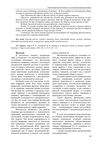 Актуальность. Современное общество все чаще обращает внимание на здоровье не только как на отсутствие болезней, но и как на состояние полного физического, психологического и социального благополучия. В этом контексте все большую значимость приобретает не только физическая активность как инструмент укрепления тела, но и ее влияние на психическое и когнитивное здоровье человека. Интеллектуальная деятельность, память, скорость мышления, концентрация внимания — все эти качества становятся предметом изу-чения в связи с образом жизни и уровнем физической нагрузки.