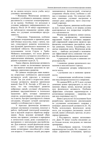 9. Еникеева Э. А. Влияние физической активности на когнитивные функции мозга у человека // Дни студенческой науки: сборник докладов научно-технической конференции по итогам научно-исследовательских работ студентов института физической культуры и спорта НИУ МГСУ за 2023-2024 учебный год. М., 2024. С. 20-24.