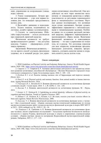 10. Левицкая С. В., Гребенюк А. К. Влияние физической активности на когнитивные функции человека: анализ современных исследований // Актуальные проблемы безопасности жизнедеятельности и защиты Родины, физической культуры и спорта в современных социокультурных условиях: сборник научных трудов по материалам Всероссийской научно-практической конференции. Хабаровск, 2025. С. 117-119.