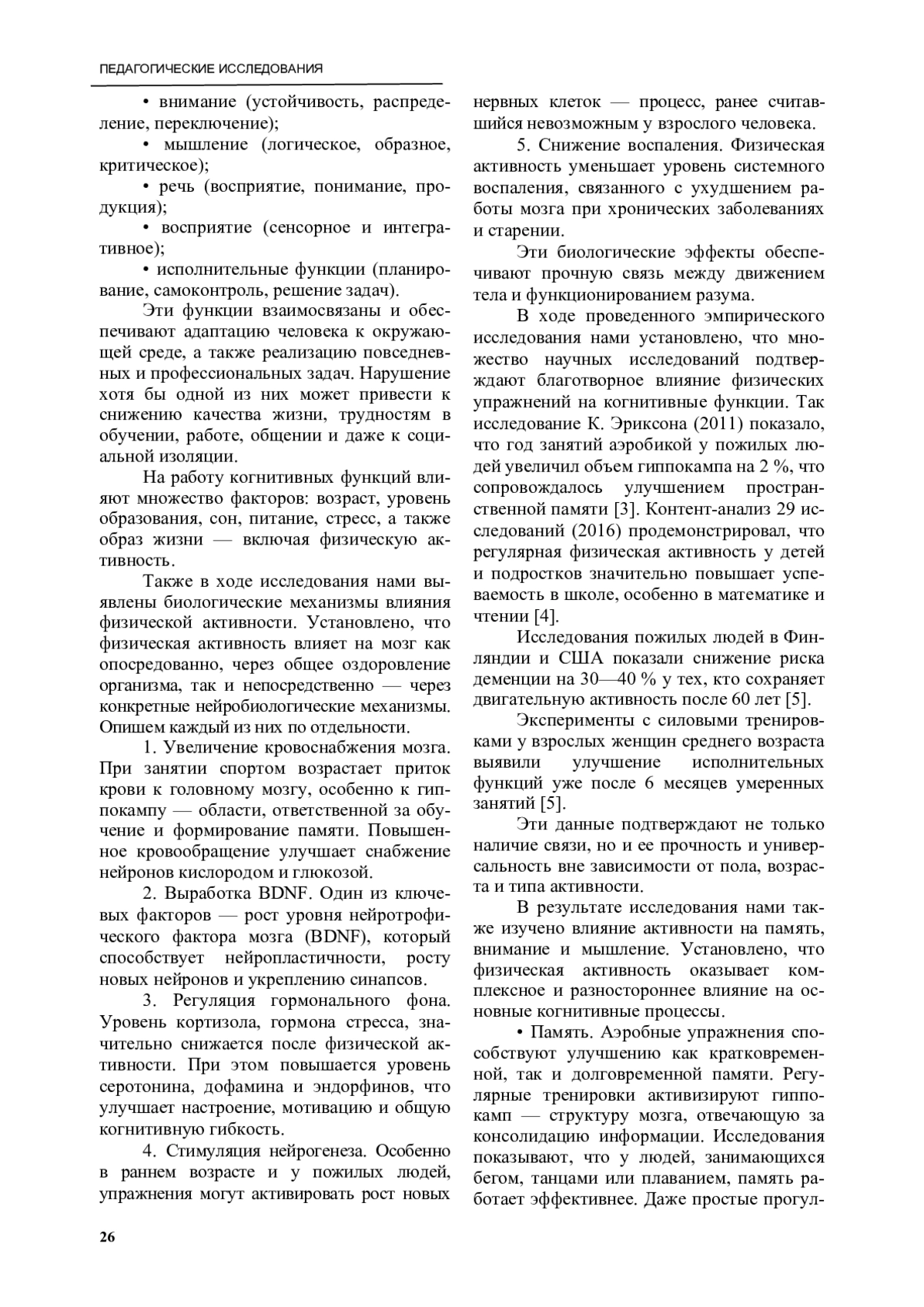 2. Страдзе А. Э., Смирнов К. Р. Активная двигательная деятельность как предиктор успешного развития когнитивных способностей обучающихся // Вестник Московского городского педагогического университета. Серия: Естественные науки. 2024. С. 109-118.