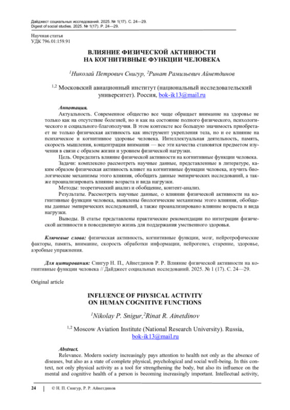 Результаты. Рассмотреть научные данные, о влиянии физической активности на когнитивные функции человека, выявлены биологические механизмы этого влияния, обобщены данные эмпирических исследований, а также проанализировано влияние возраста и вида нагрузки.