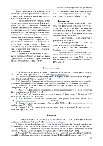 Выводы. Развитие физической культуры в России требует комплексного подхода, включающего увеличение финансирования, подготовку квалифицированных специалистов, расширение доступности спортивной инфраструктуры и проведение эффективных кампаний по популяризации здорового образа жизни. Решение этих проблем будет способствовать улучшению здоровья населения и повышению качества жизни.