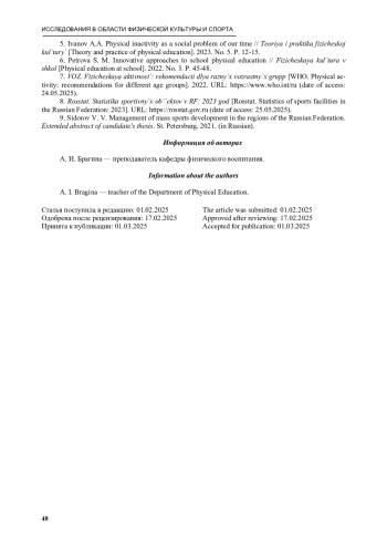 6. Петрова С. М. Инновационные подходы к школьной физкультуре // Физическая ВОЗ культура в школе. 2022. № 3. С. 45-48.
