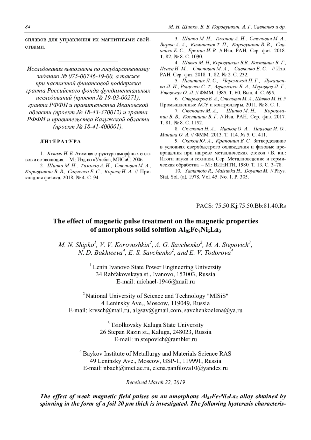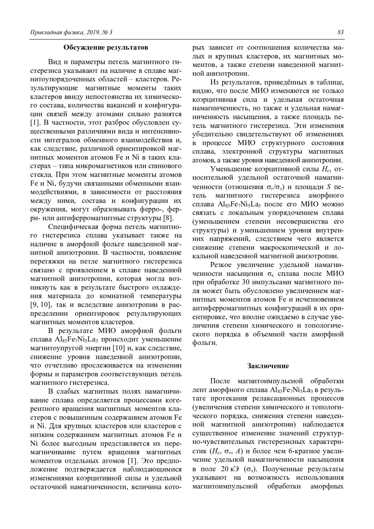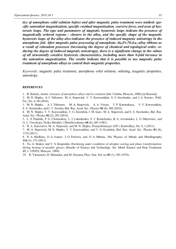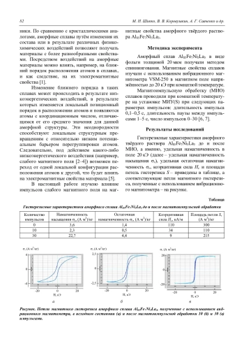 ШИПКО М. Н., КОРОВУШКИН В. В., САВЧЕНКО А. Г., СТЕПОВИЧ М. А., БАХТЕЕВА Н. Д., САВЧЕНКО Е. С., ТОДОРОВА Е. В. ВЛИЯНИЕ МАГНИТОИМПУЛЬСНОЙ ОБРАБОТКИ НА МАГНИТНЫЕ СВОЙСТВА АМОРФНОГО ТВЁРДОГО РАСТВОРА AL85FE7NI5LA3 // ПРИКЛАДНАЯ ФИЗИКА. 2019. №3